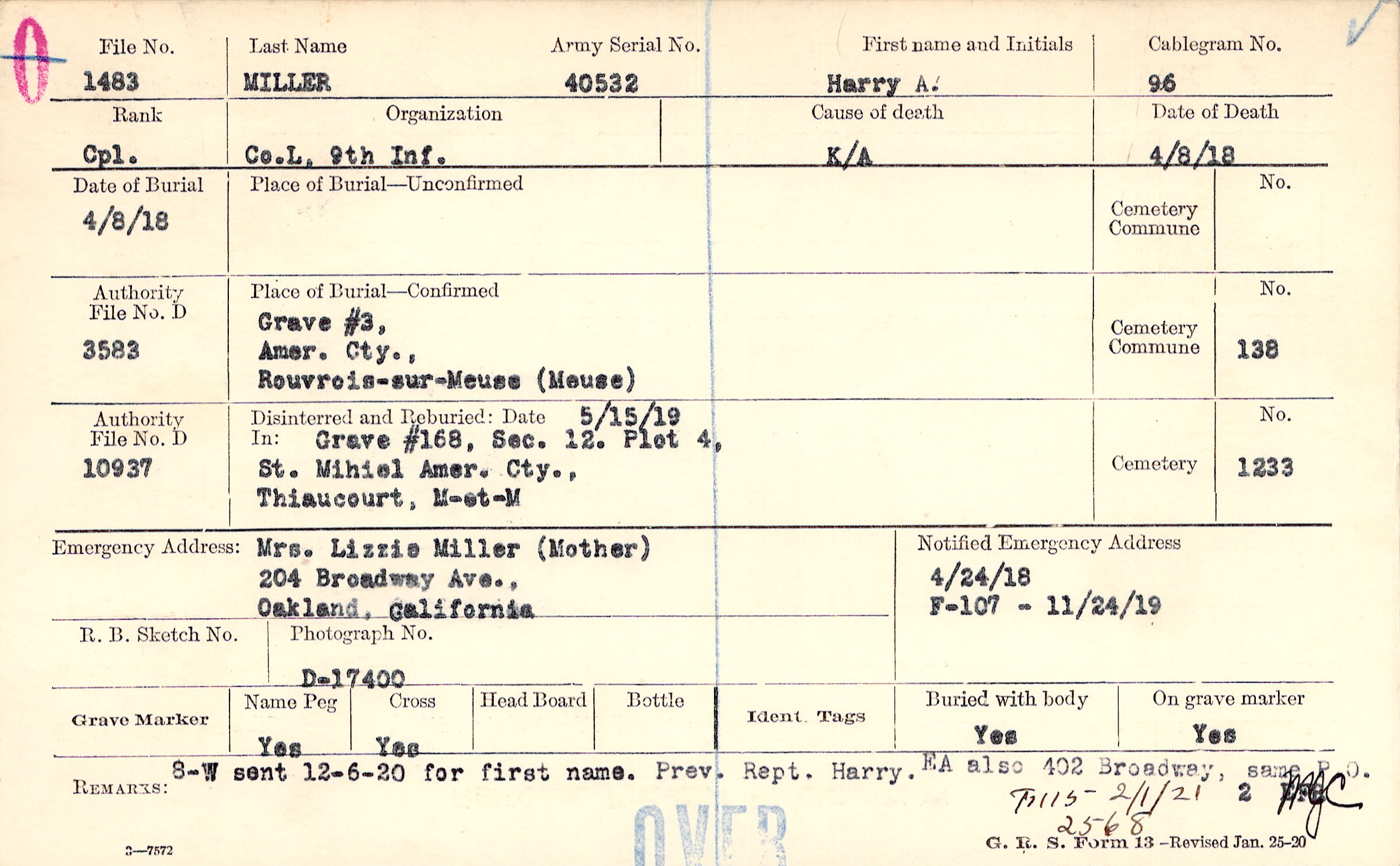 Mrs. Lizzie Miller (Mother), 204 Broadway Ave., Oakland, California