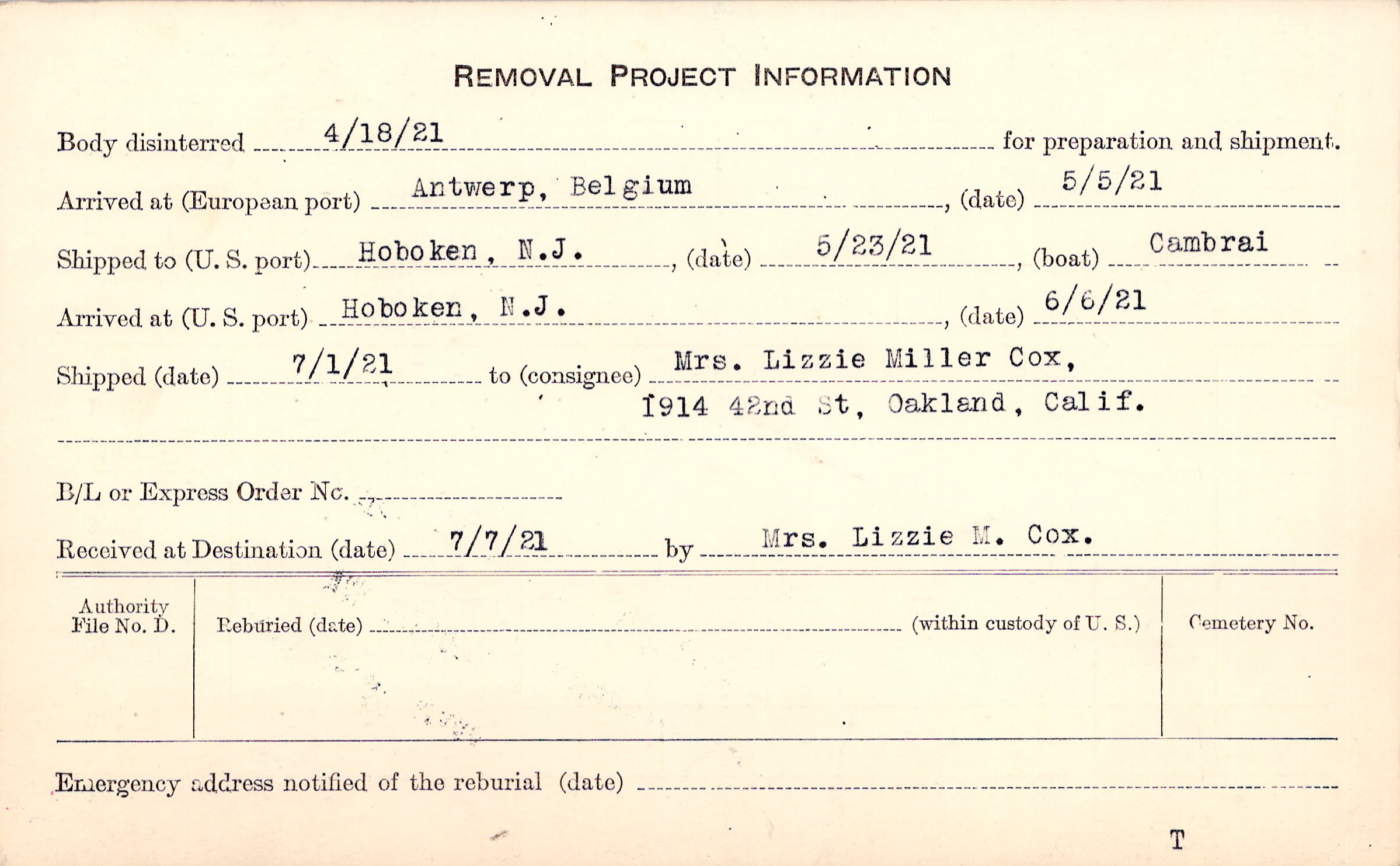Body disinterred 4/18/1921 for preparation and shipment.