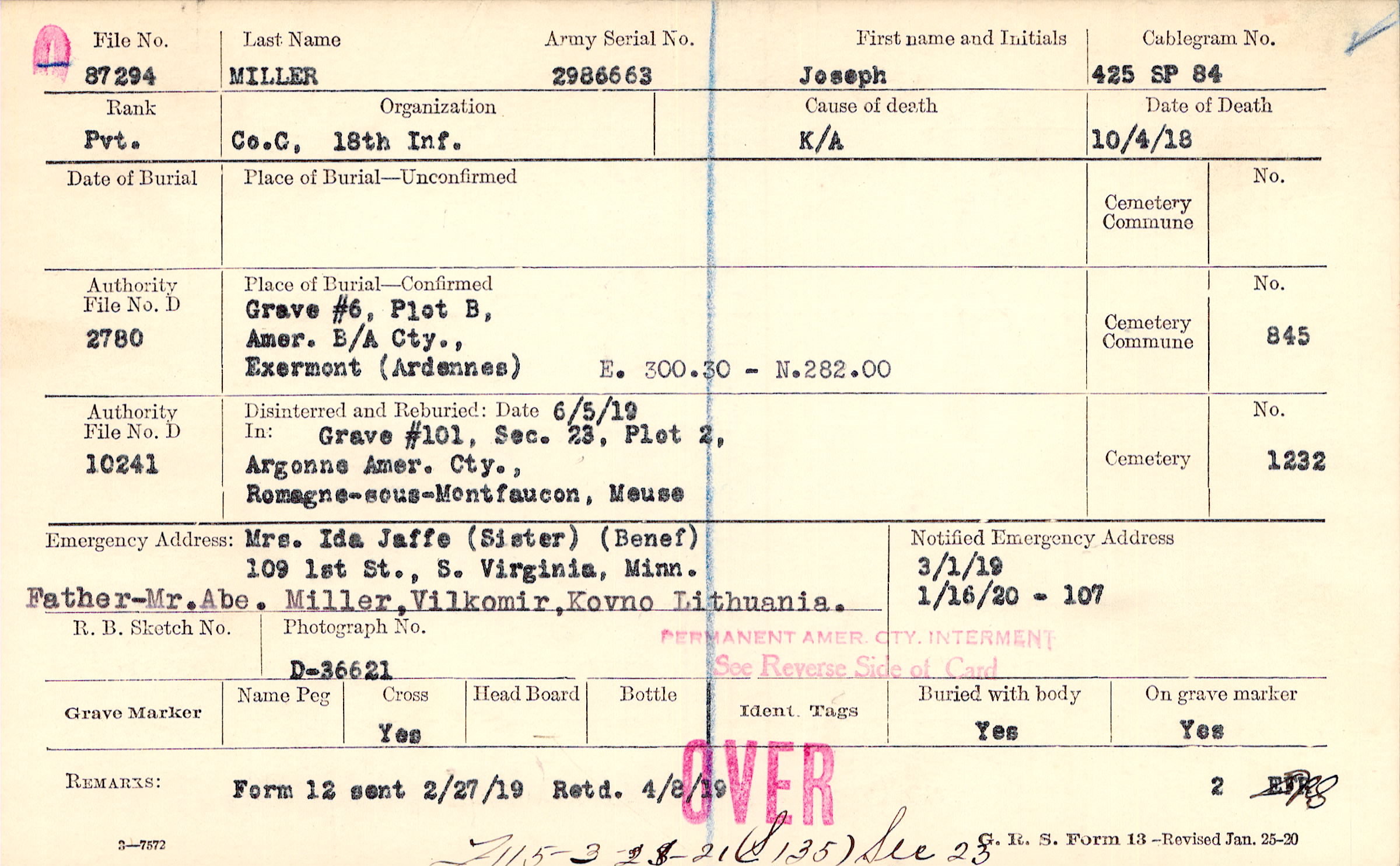 Mrs. Ida Jaffe (Sister), 109 1st St., S. Virginia, Minn., (Benef) Father-Mr. Abe. Miller, Vilkomir, Kovno, Lithuania.