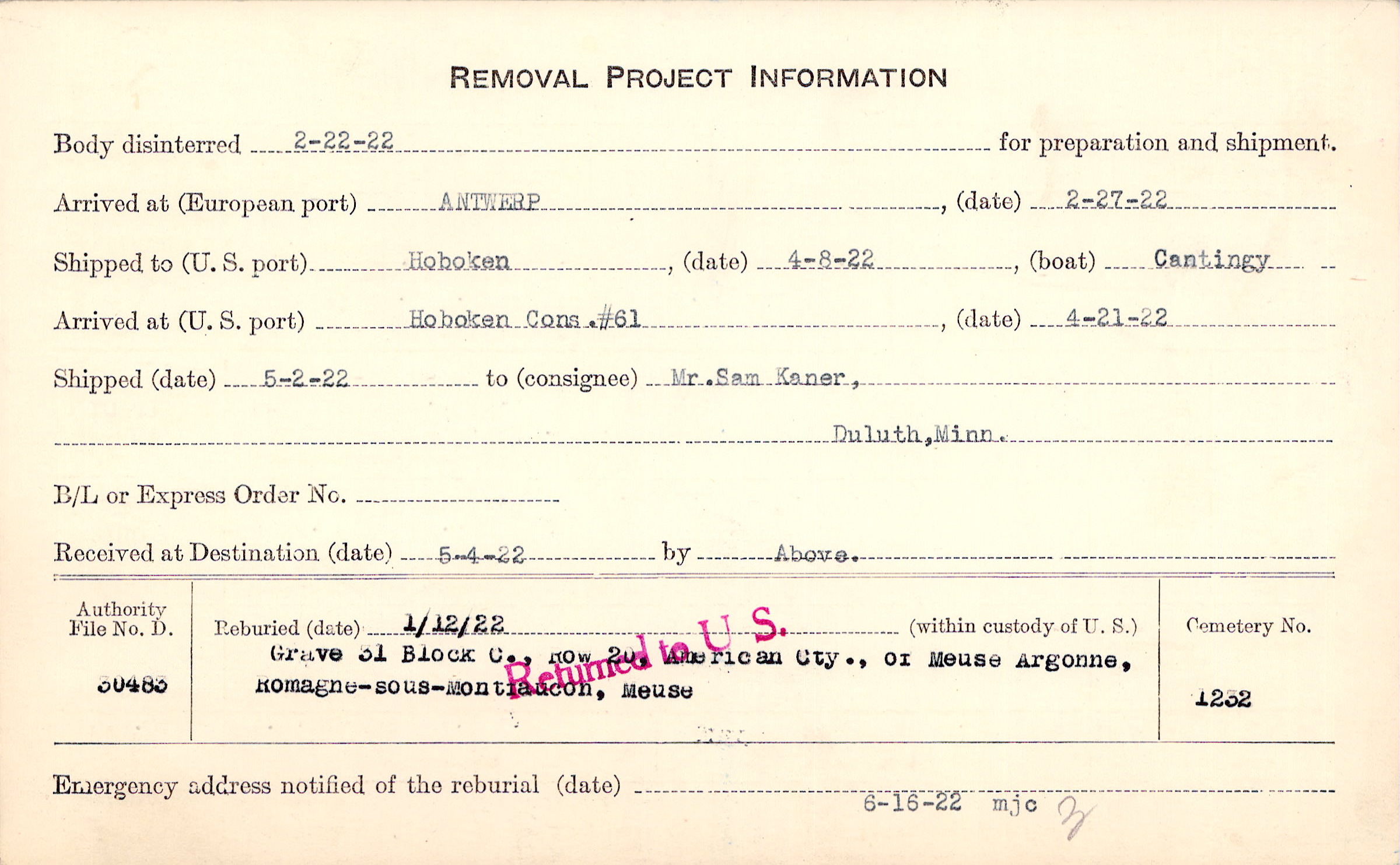 Body disinterred 2/22/1922 for preparation and shipment.