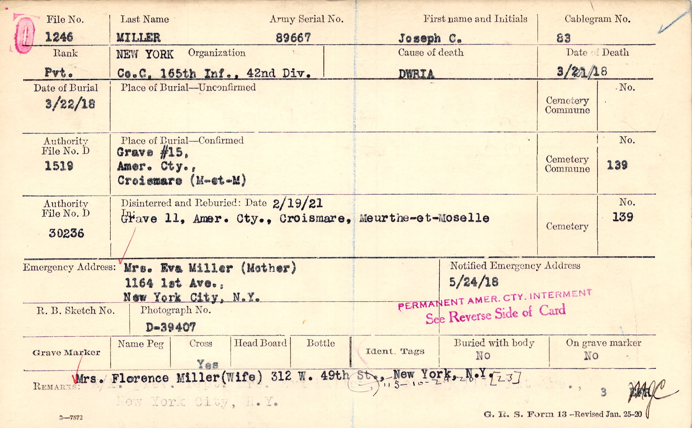 Mrs. Eva Miller (Mother), 1164 1st Ave., New York City, N.Y.