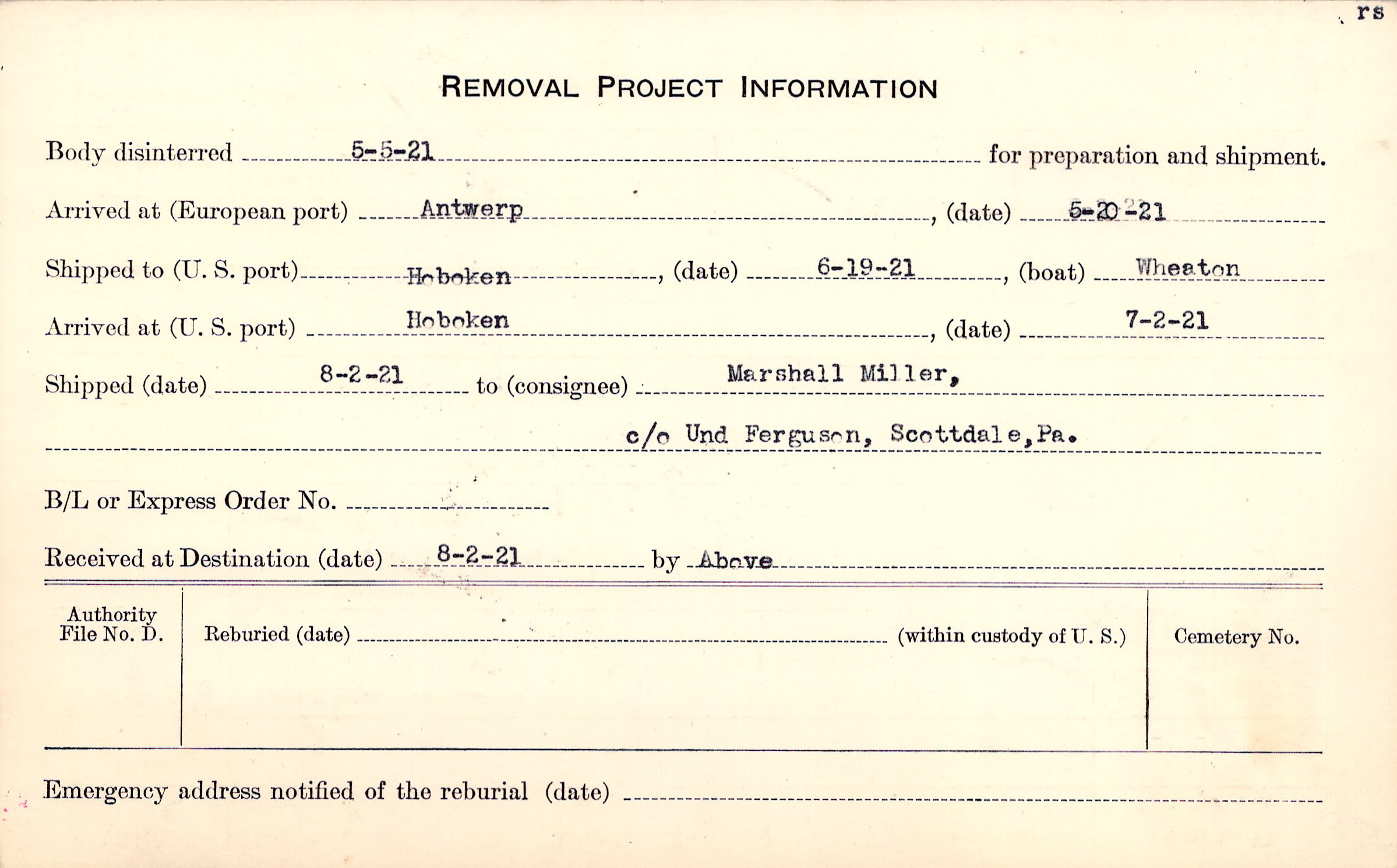to Marshall Miller, c/o Und Ferguson, Scottsdale, Pa.