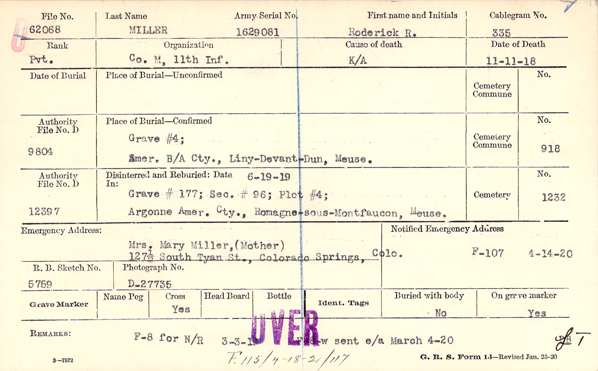 Mrs. Mary Miller, (Mother), 127 1/2 South Tyan St., Colorado Springs, Colo.