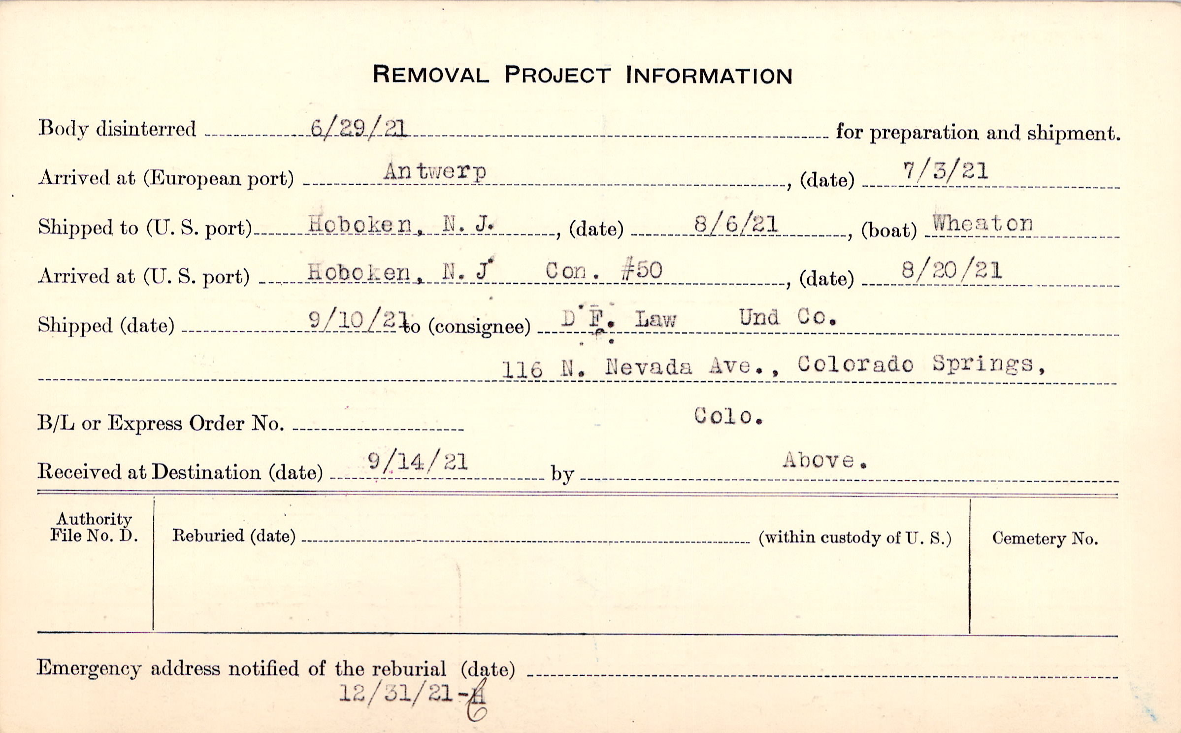 Body disinterred 6/29/1921 for preparation and shipment.