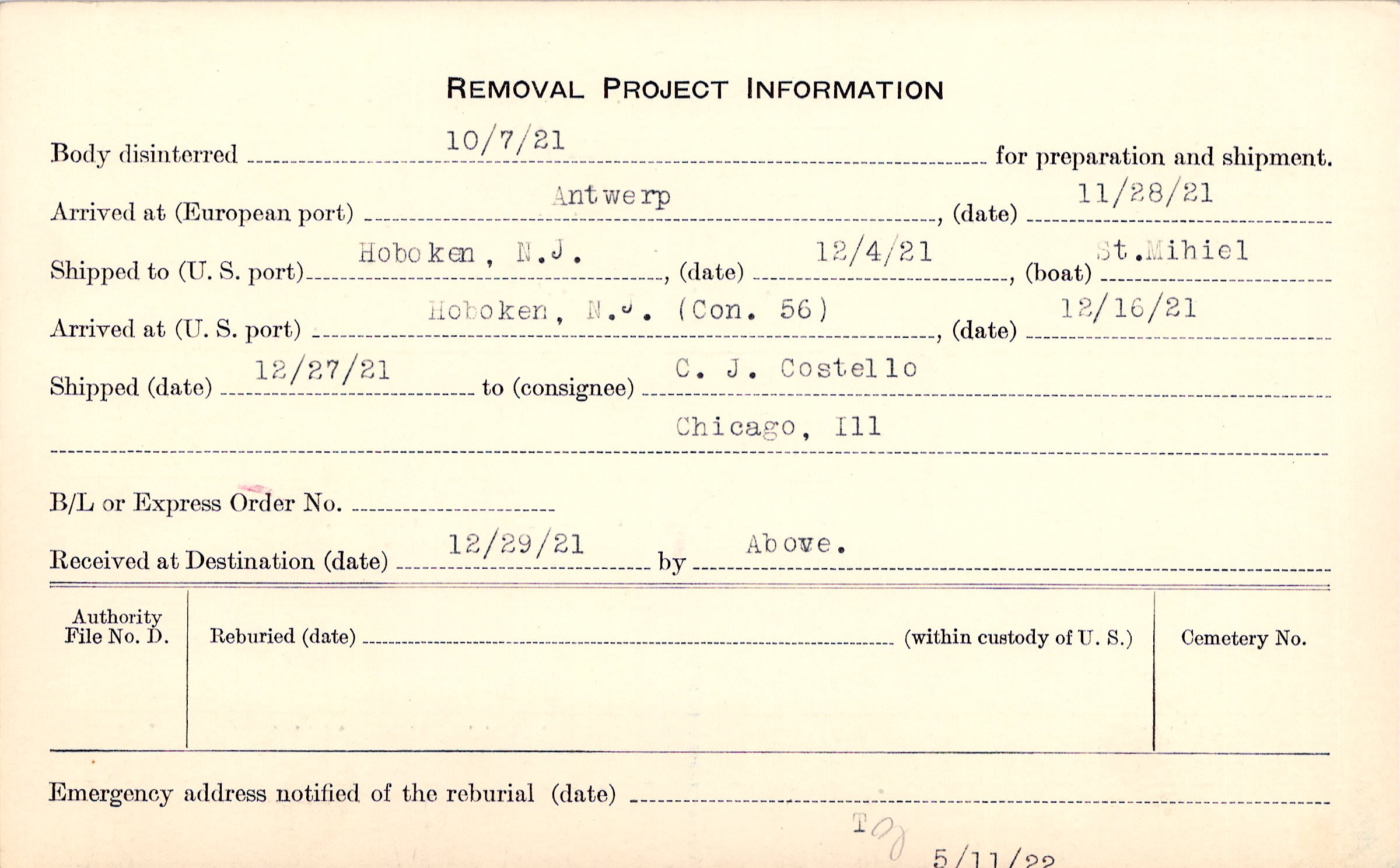 Body disinterred 10/7/1921 for preparation and shipment.