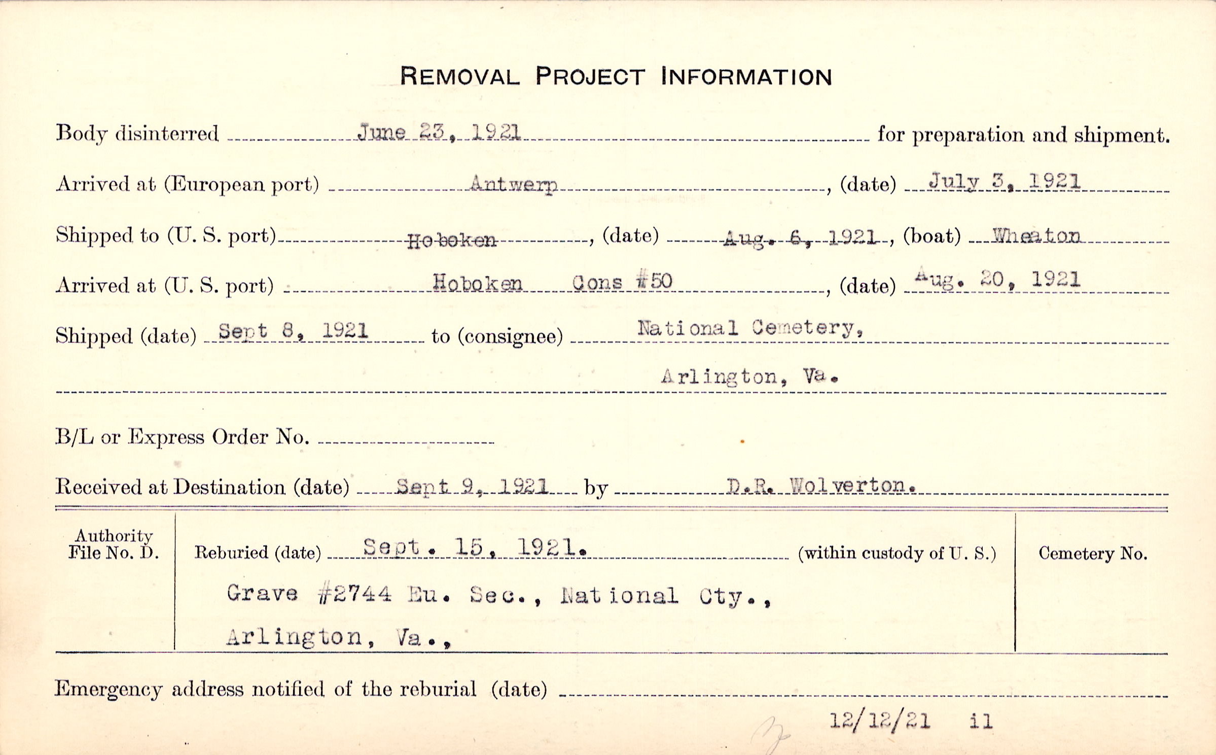 Body disinterred 6/23/1921 for preparation and shipment.