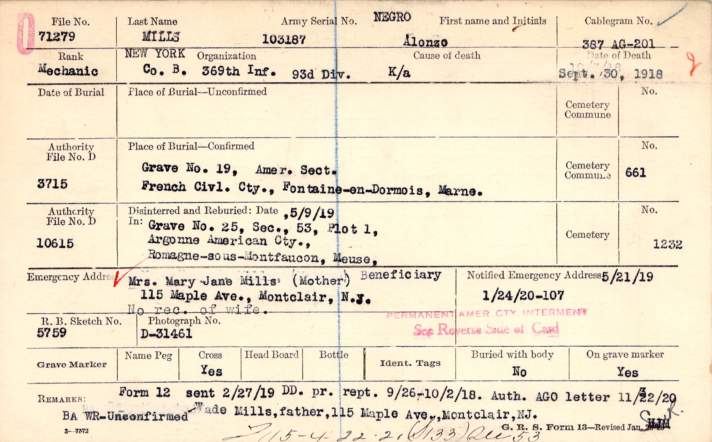 Grave 19, Amer. Sect., French Civl. Cty., Fontaine-en-Dormois, Marne