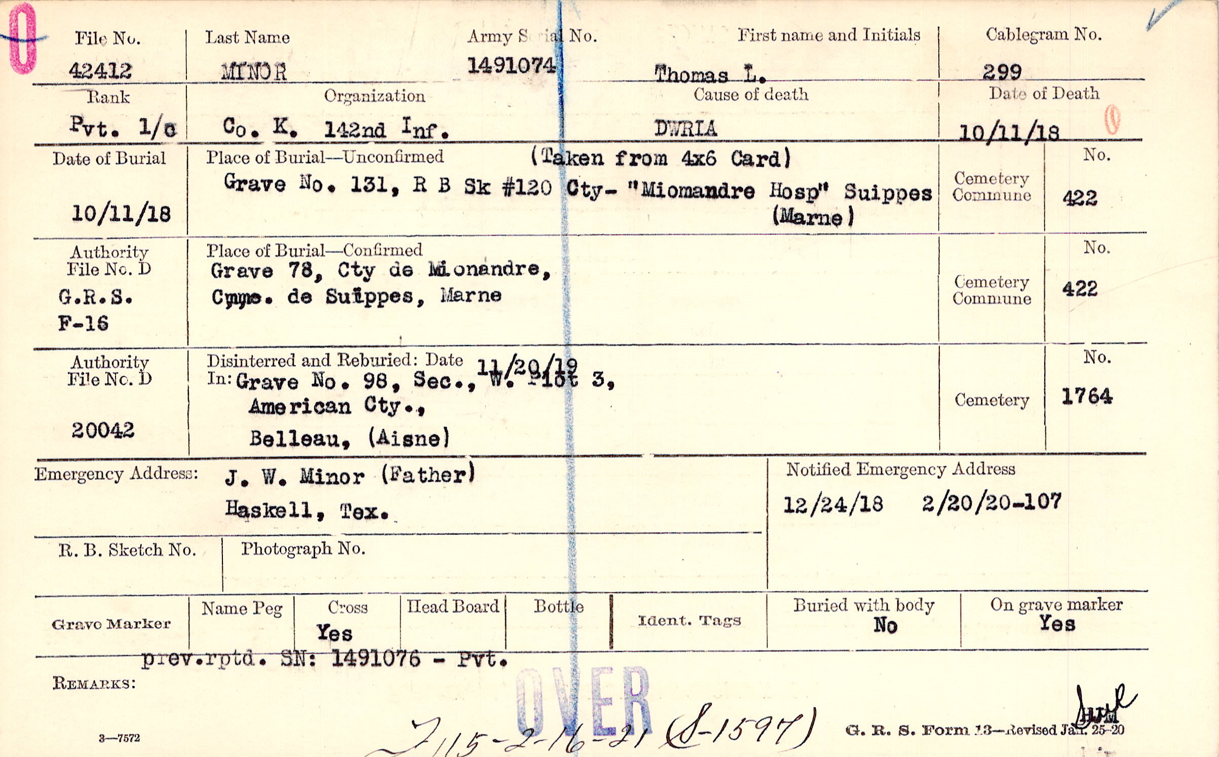 Grave 98, Section W, Plot 3, American Cemetery, Belleau, Aisne