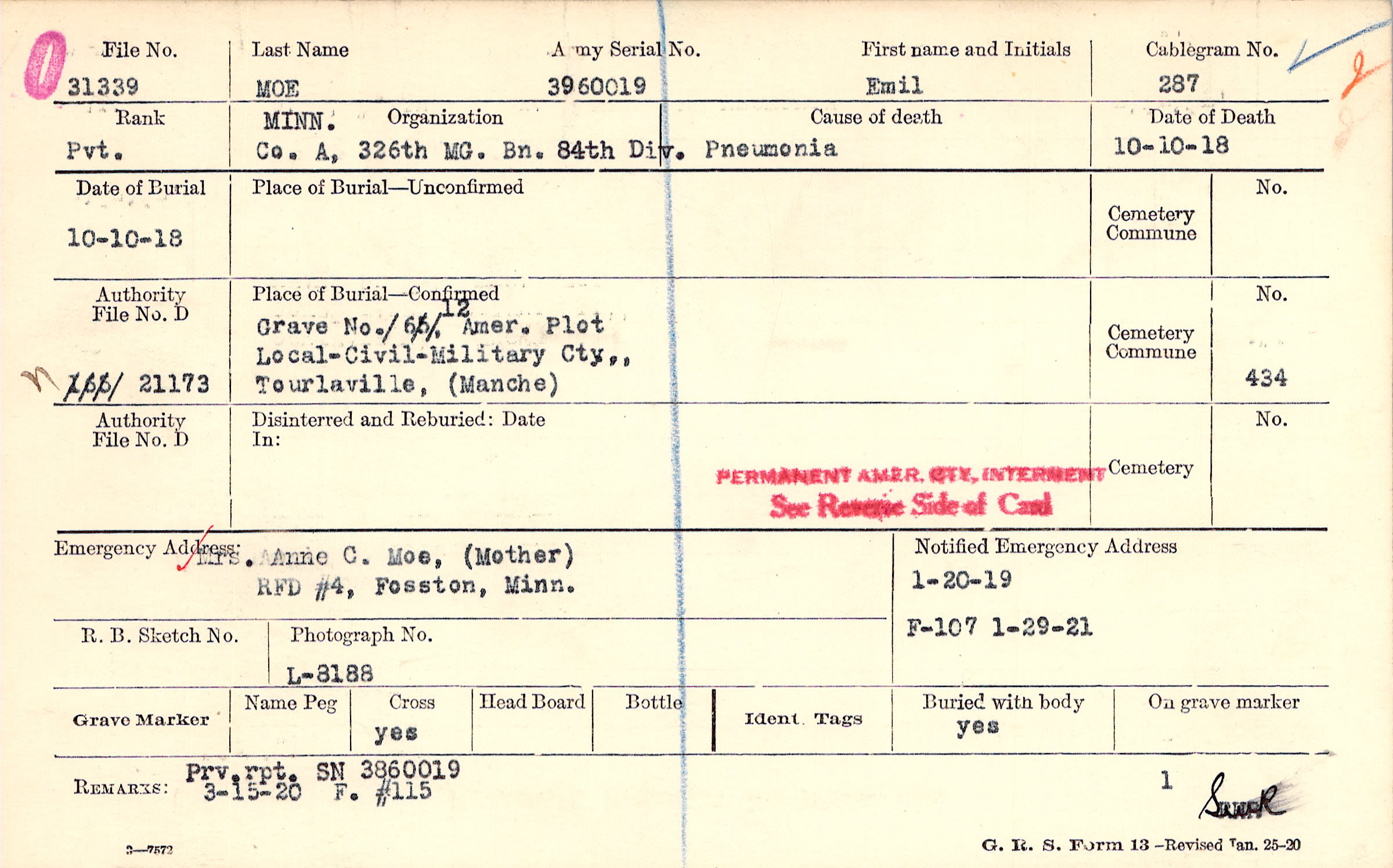 Mrs. Anne C. Moe, (Mother), RFD #4, Fosston, Minn.