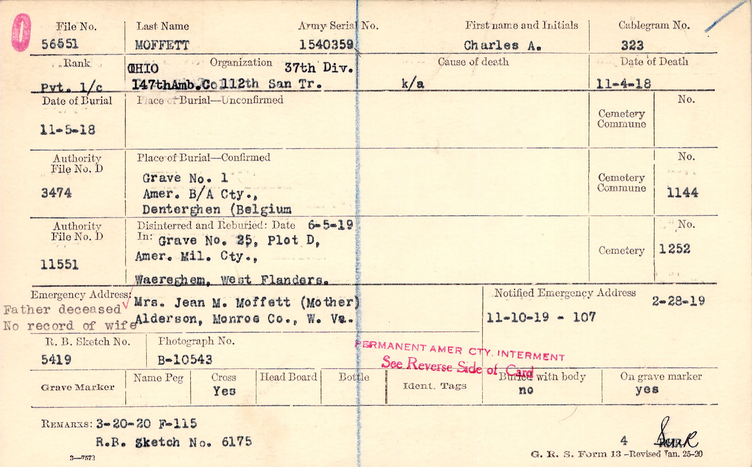 Mrs. Jean M. Moffett (Mother), Alderson, Monroe Co., W. Va., Father deceased No record of wife