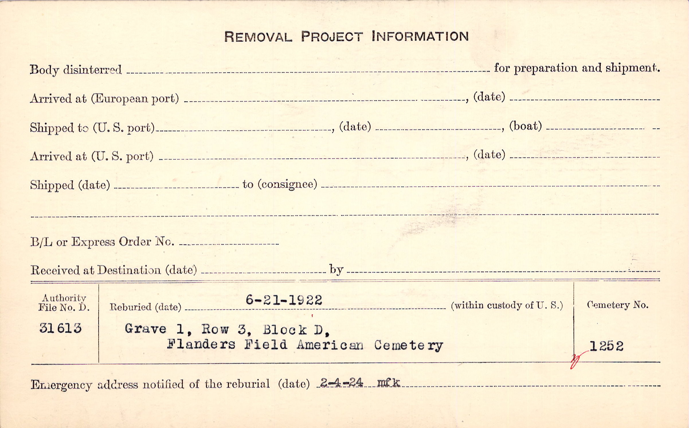 | Permanent Burial in Foreign Cemetery |