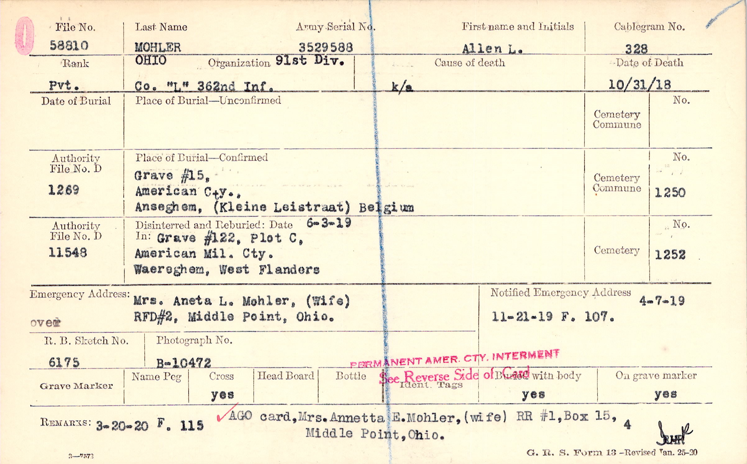 Mrs. Aneta L. Mohler, (Wife), RFD#2, Middle Point, Ohio., over