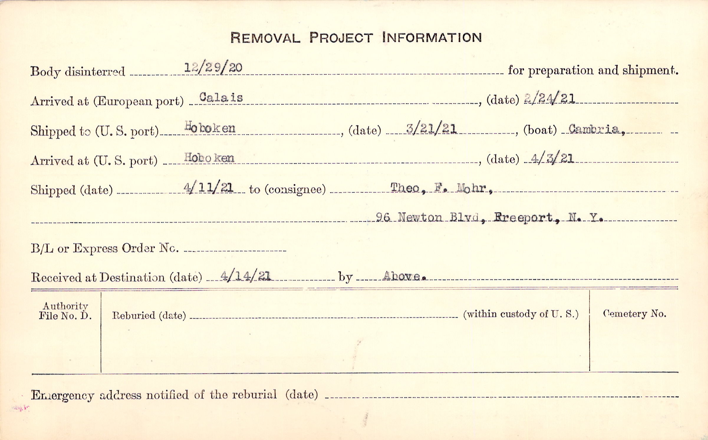 Body disinterred 12/29/1920 for preparation and shipment.
