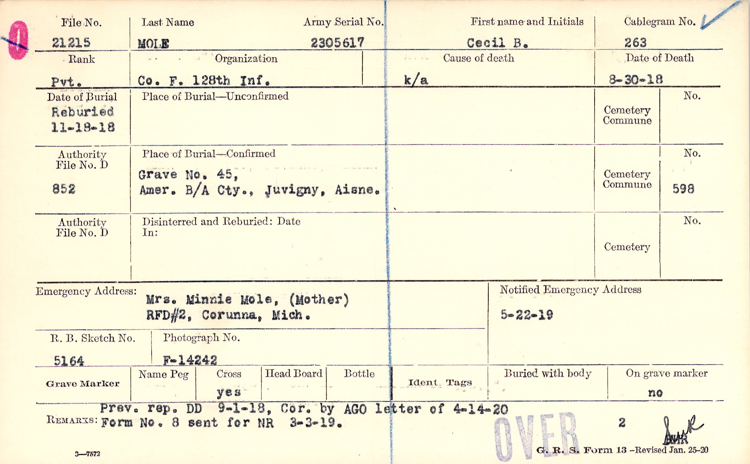 Mrs. Minnie Mole, (Mother), RFD#2, Corunna, Mich.