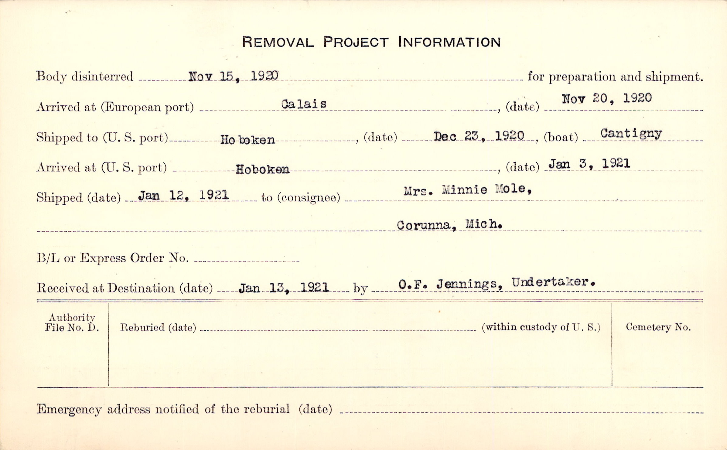 Body disinterred 11/15/1920 for preparation and shipment.