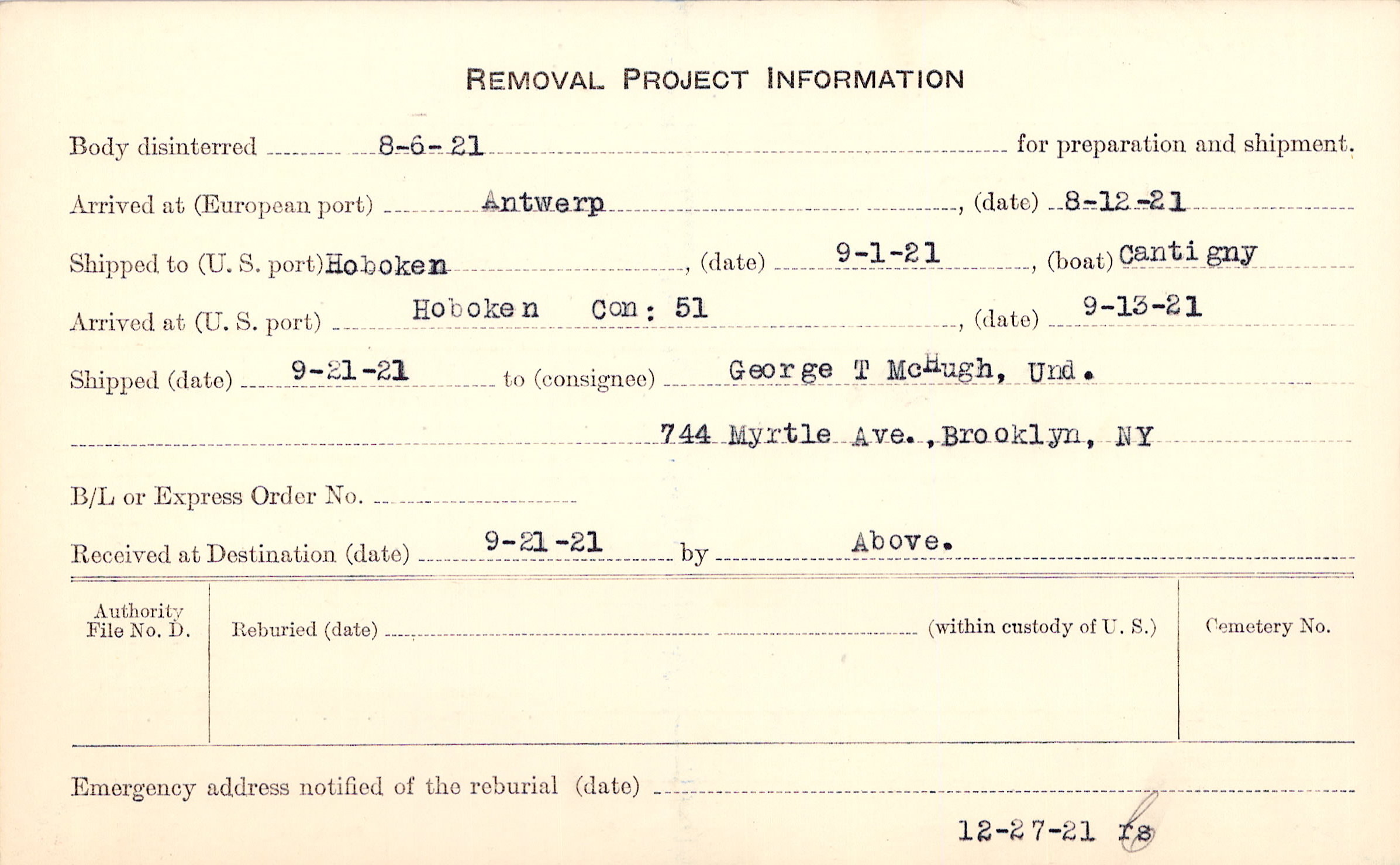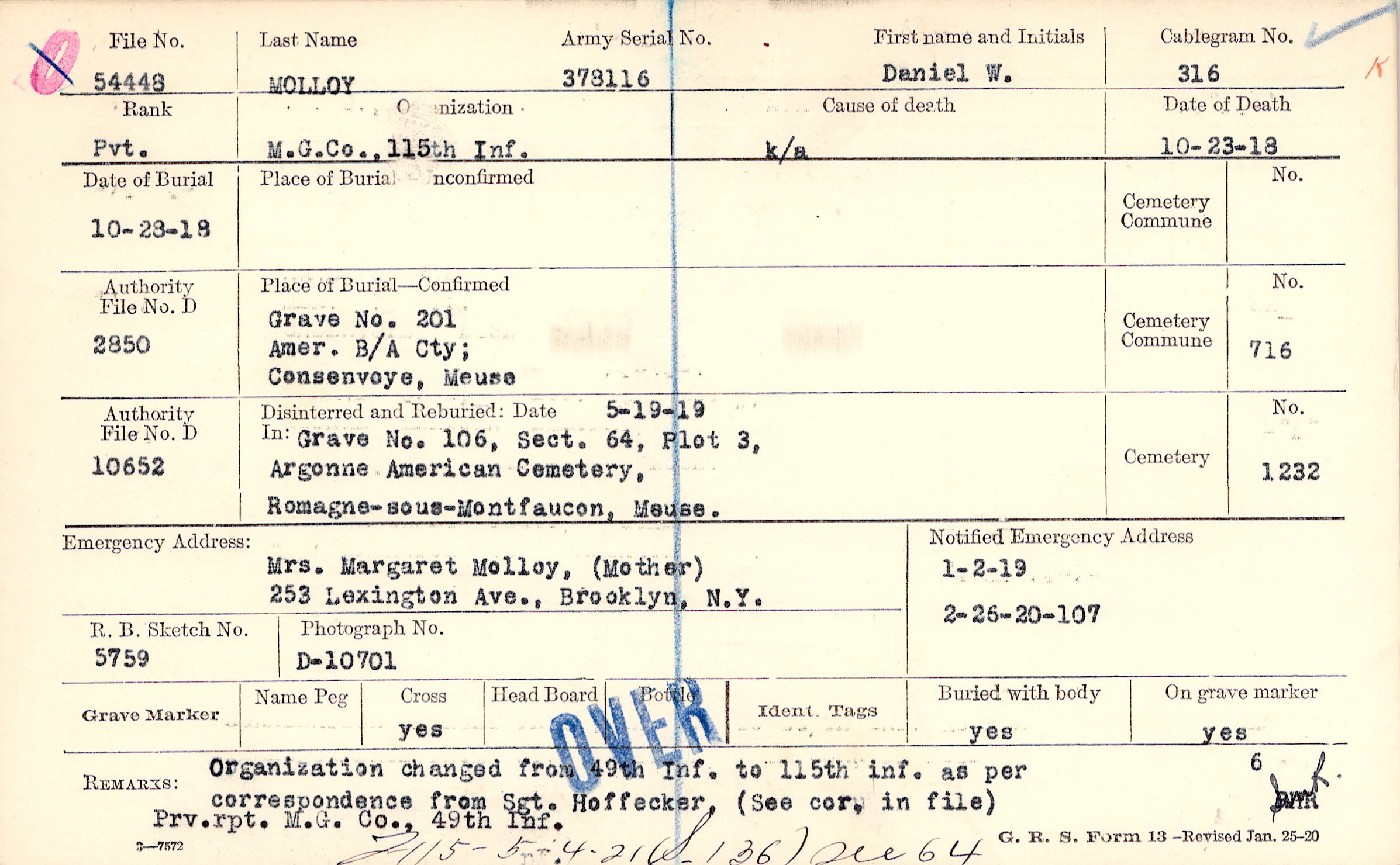 Mrs. Margaret Molloy, (Mother), 253 Lexington Ave., Brooklyn, N.Y.