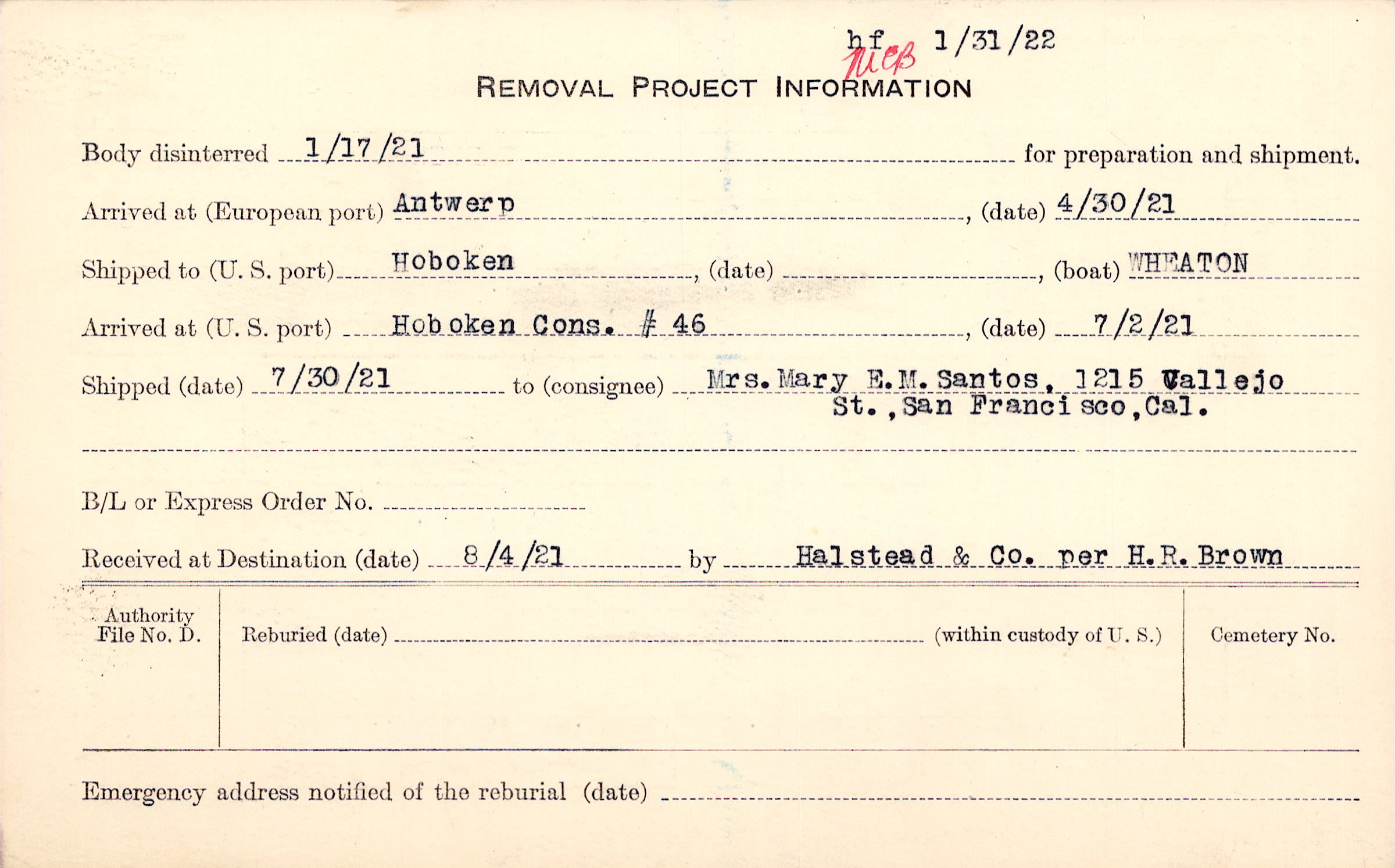 Body disinterred 1/17/1921 for preparation and shipment.