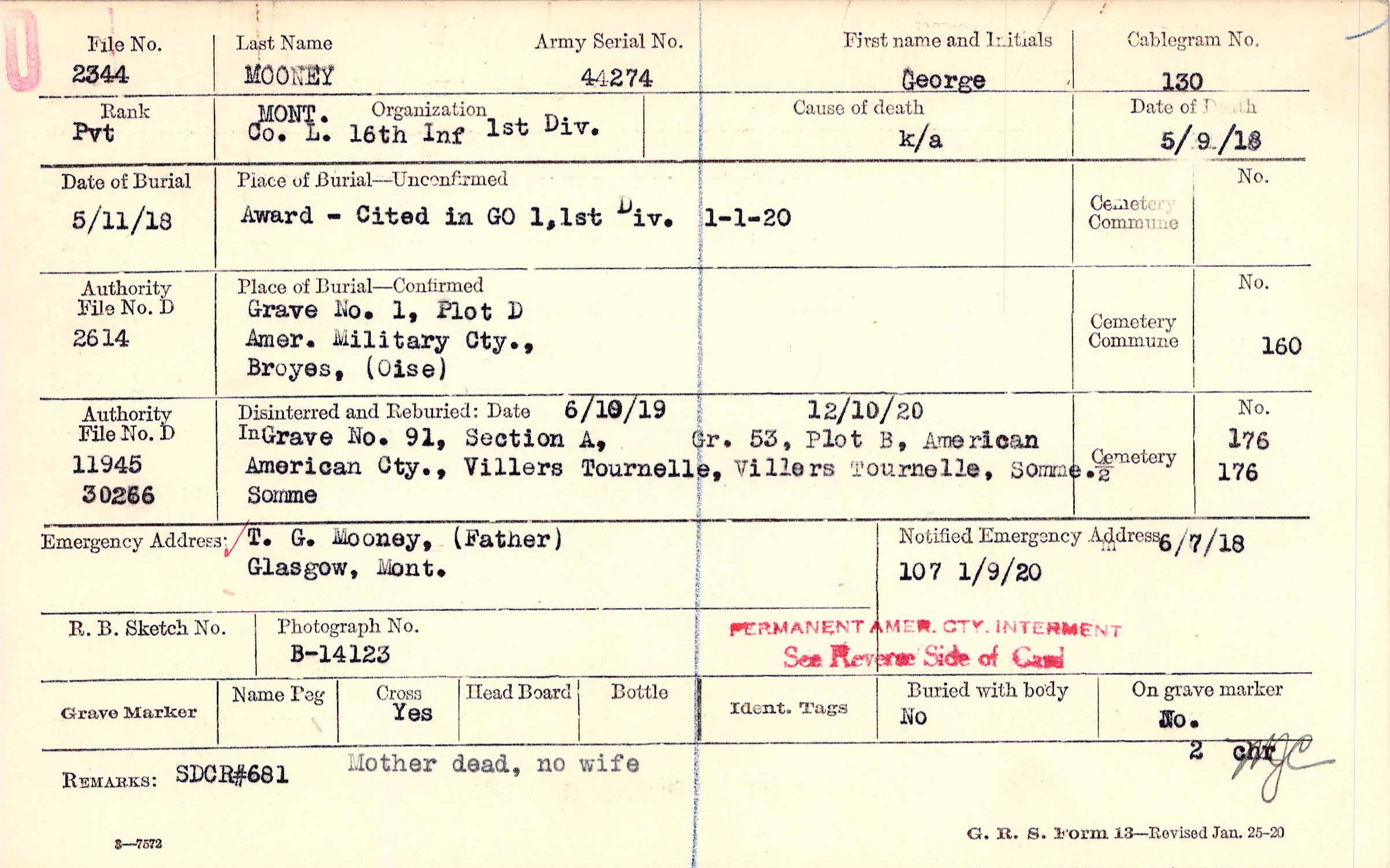 Grave 1, Plot D, Amer. Military Cty., Broyes, Oise.