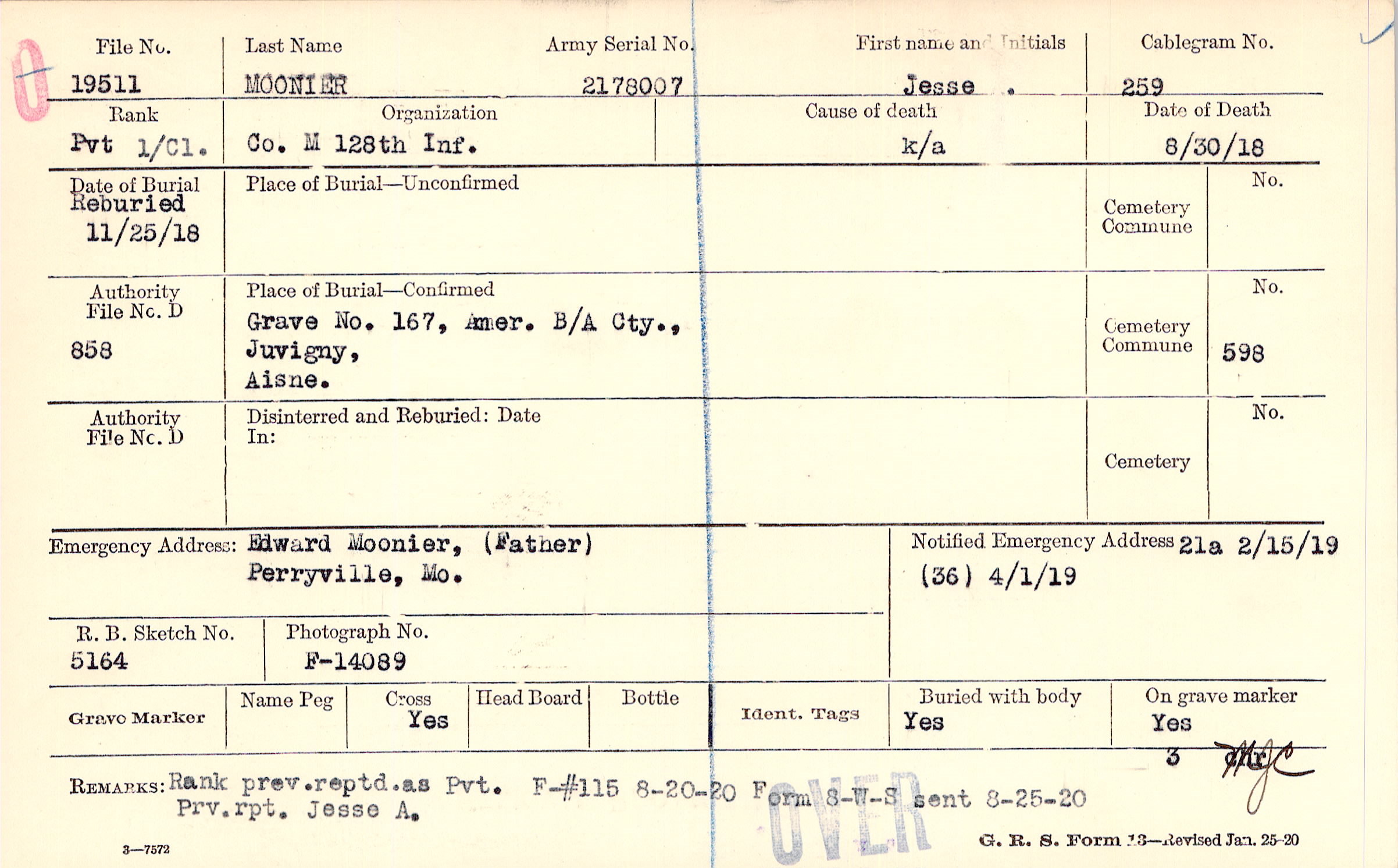 Rank prev. repd. as Pvt. Prv. rpt. Jesse A. Form 8-W-S sent 8-25-20