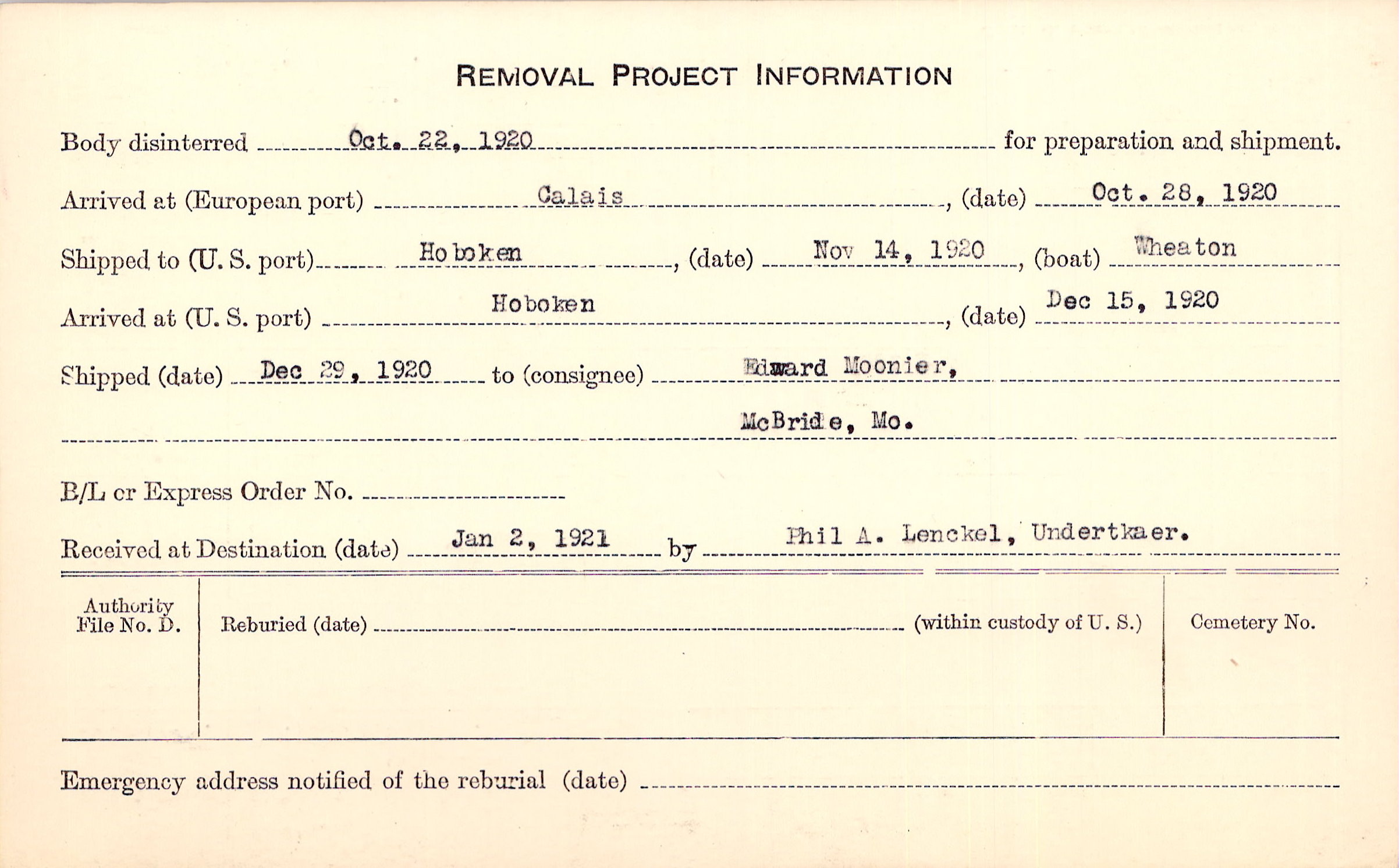 Body disinterred 10/22/1920 for preparation and shipment.