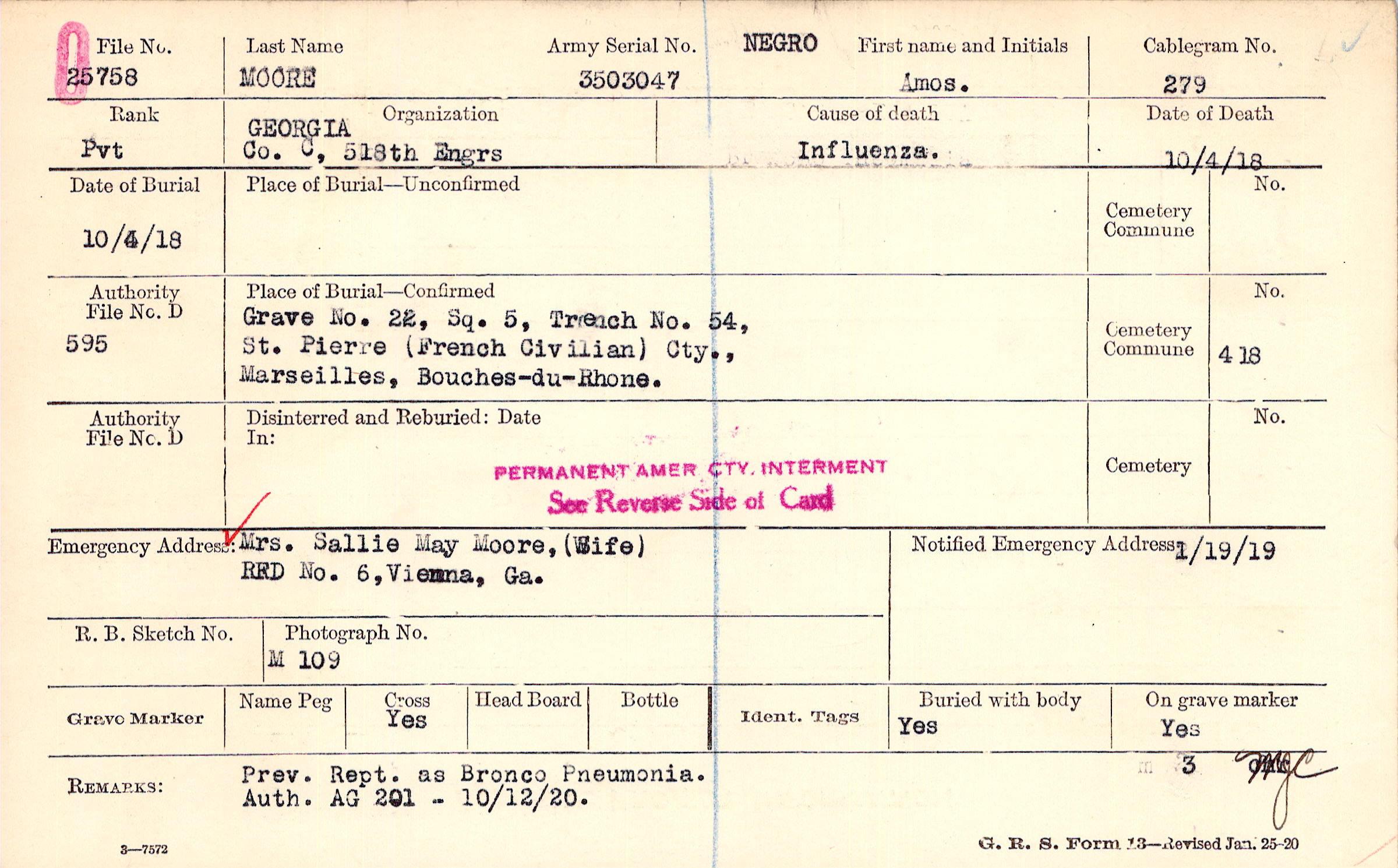 Grave 22, Sq. 5, Trench 54,St. Pierre, French Civilian Cty.,Marseilles, Bouches-du-Rhone.