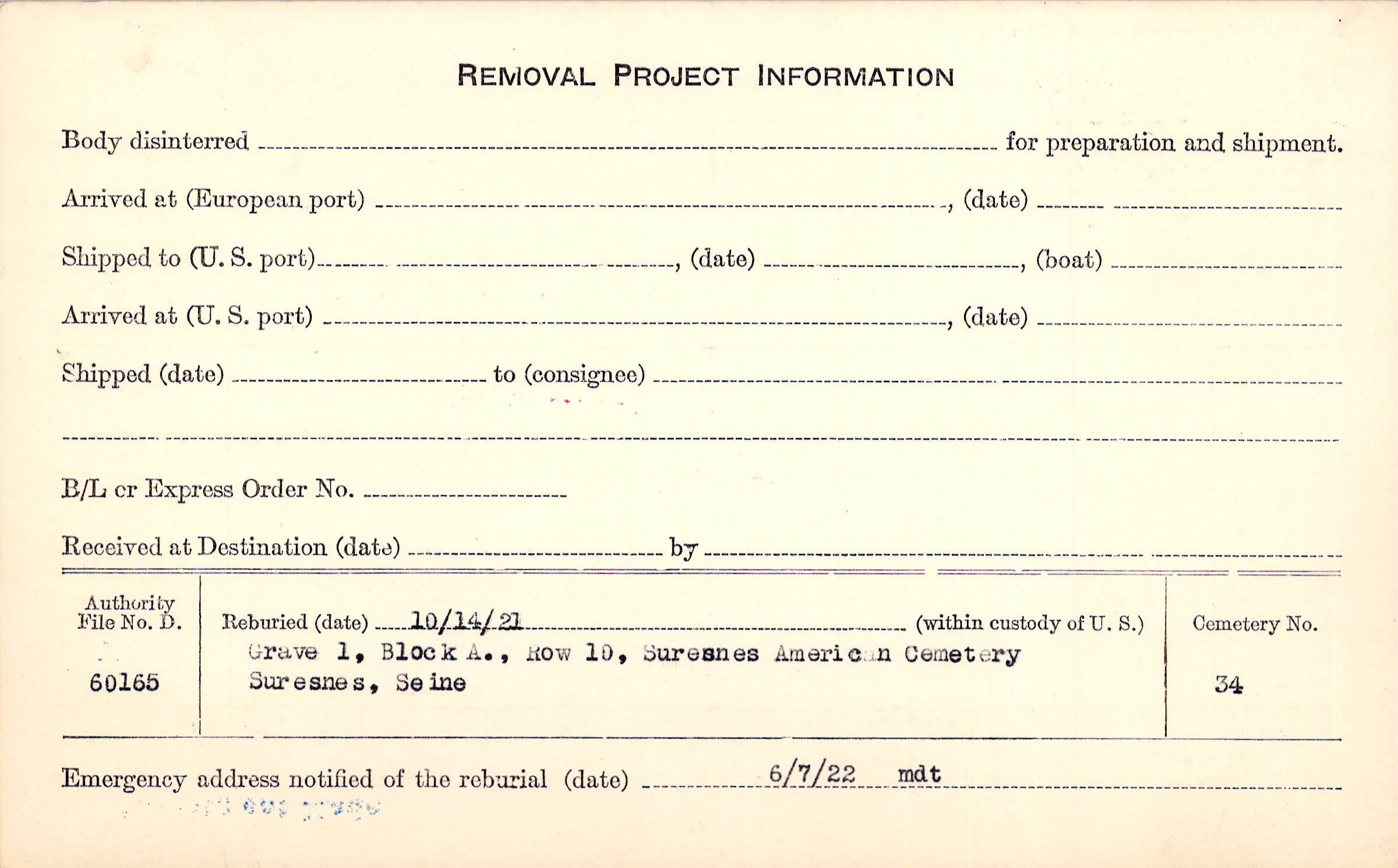 | Permanent Burial in Foreign Cemetery |