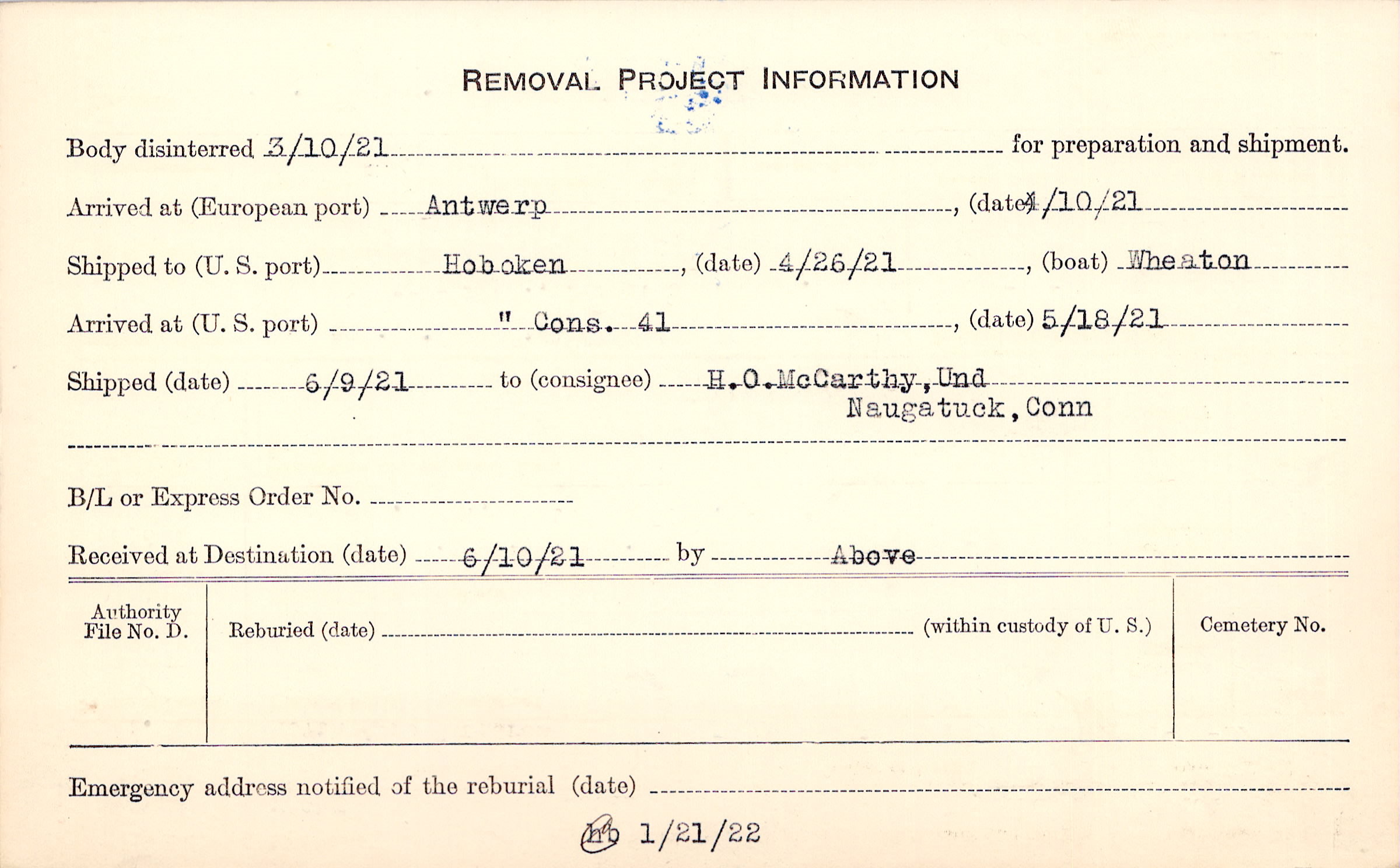 Body disinterred 3/10/1921 for preparation and shipment.