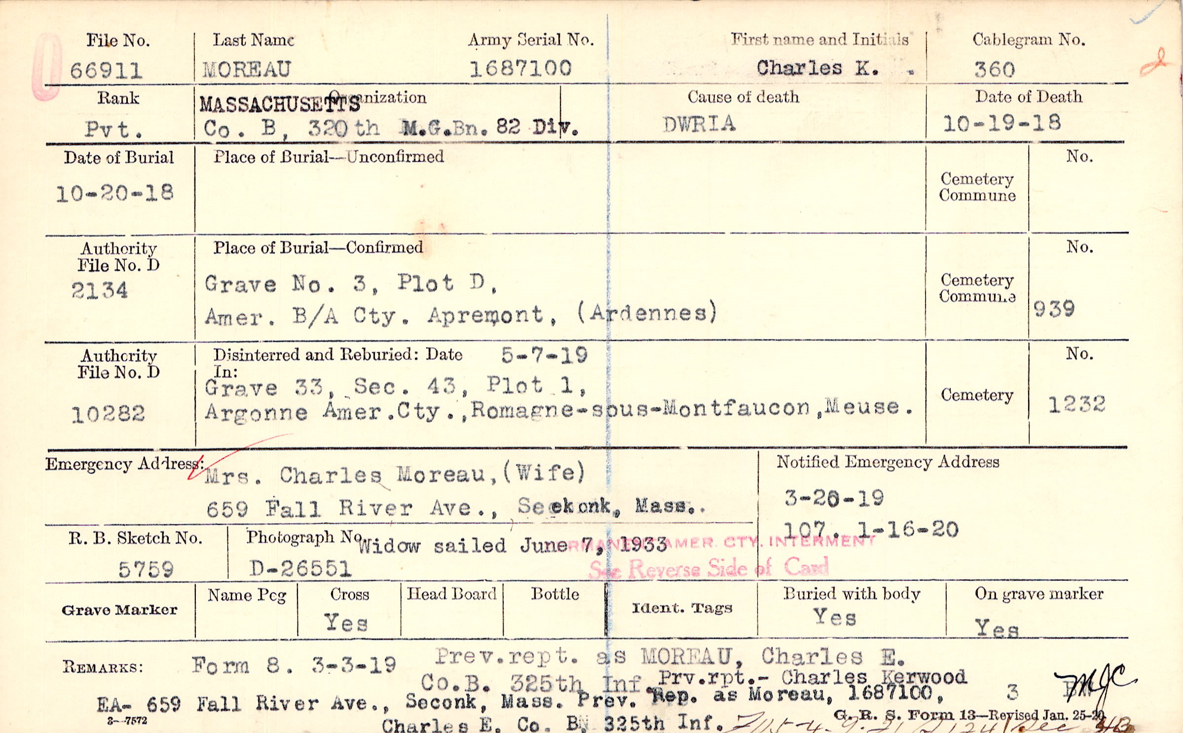 Mrs. Charles Moreau, (Wife), 659 Fall River Ave., Seekonk, Mass. Widow sailed June 7 1933, Widow sailed June 7, 1933