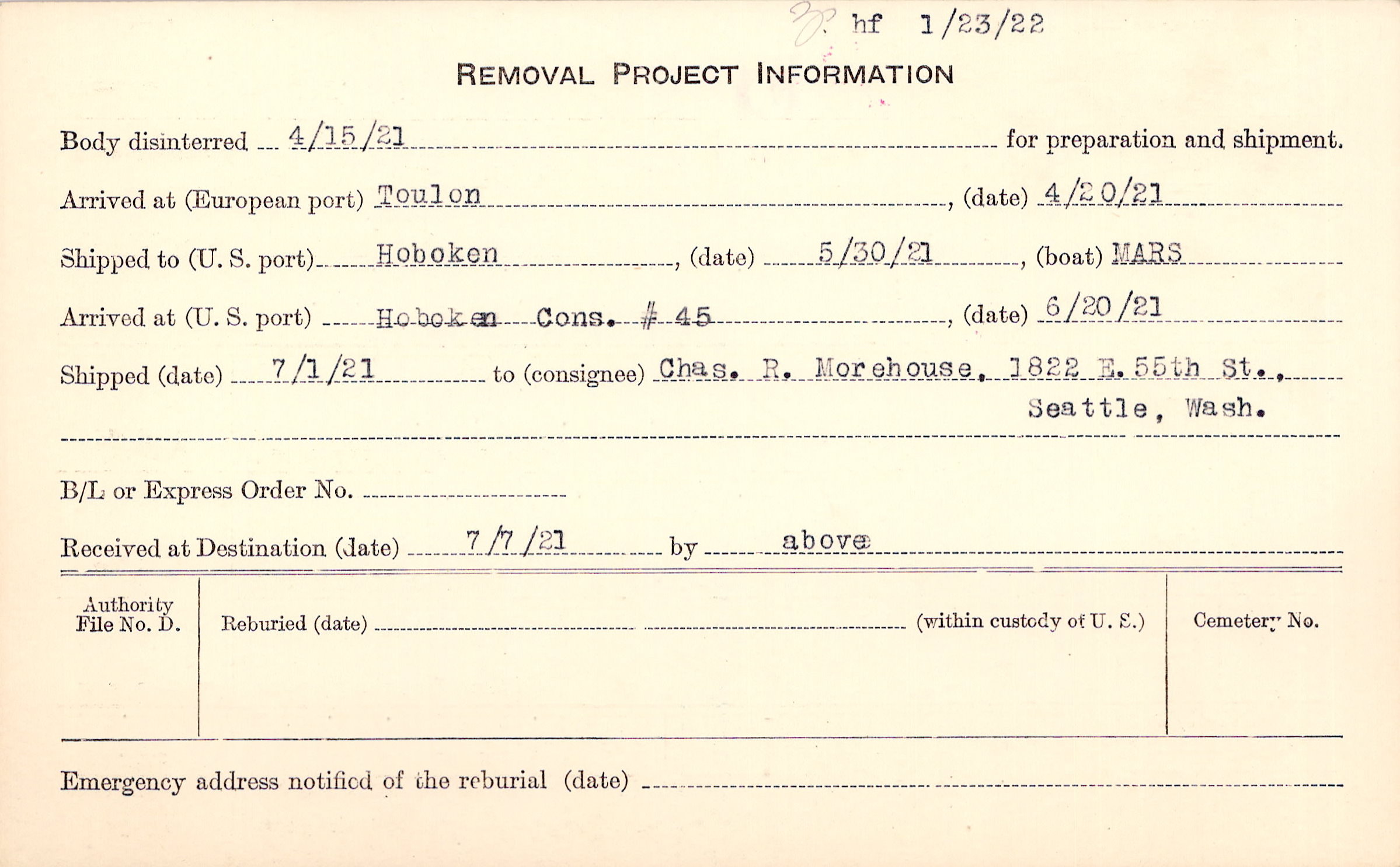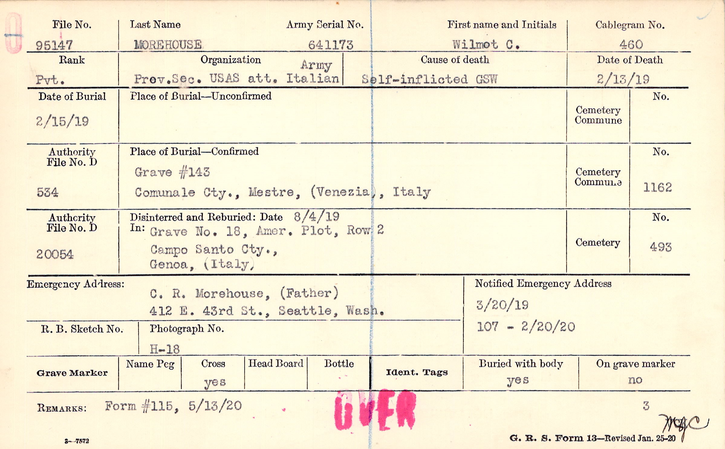 C. R. Morehouse, (Father), 412 E. 43rd St., Seattle, Wash.