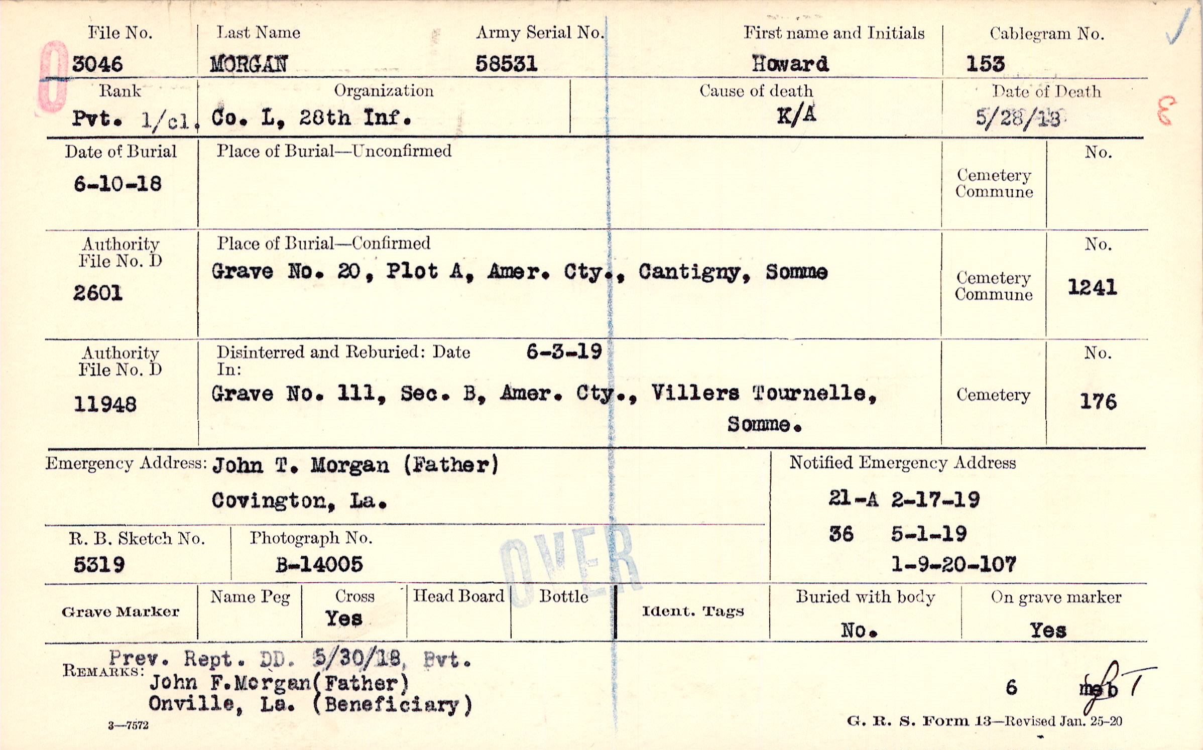 Prev. Rept. DD. 5/30/18, Pvt. John F. Morgan (Father) Onville, La. (Beneficiary)