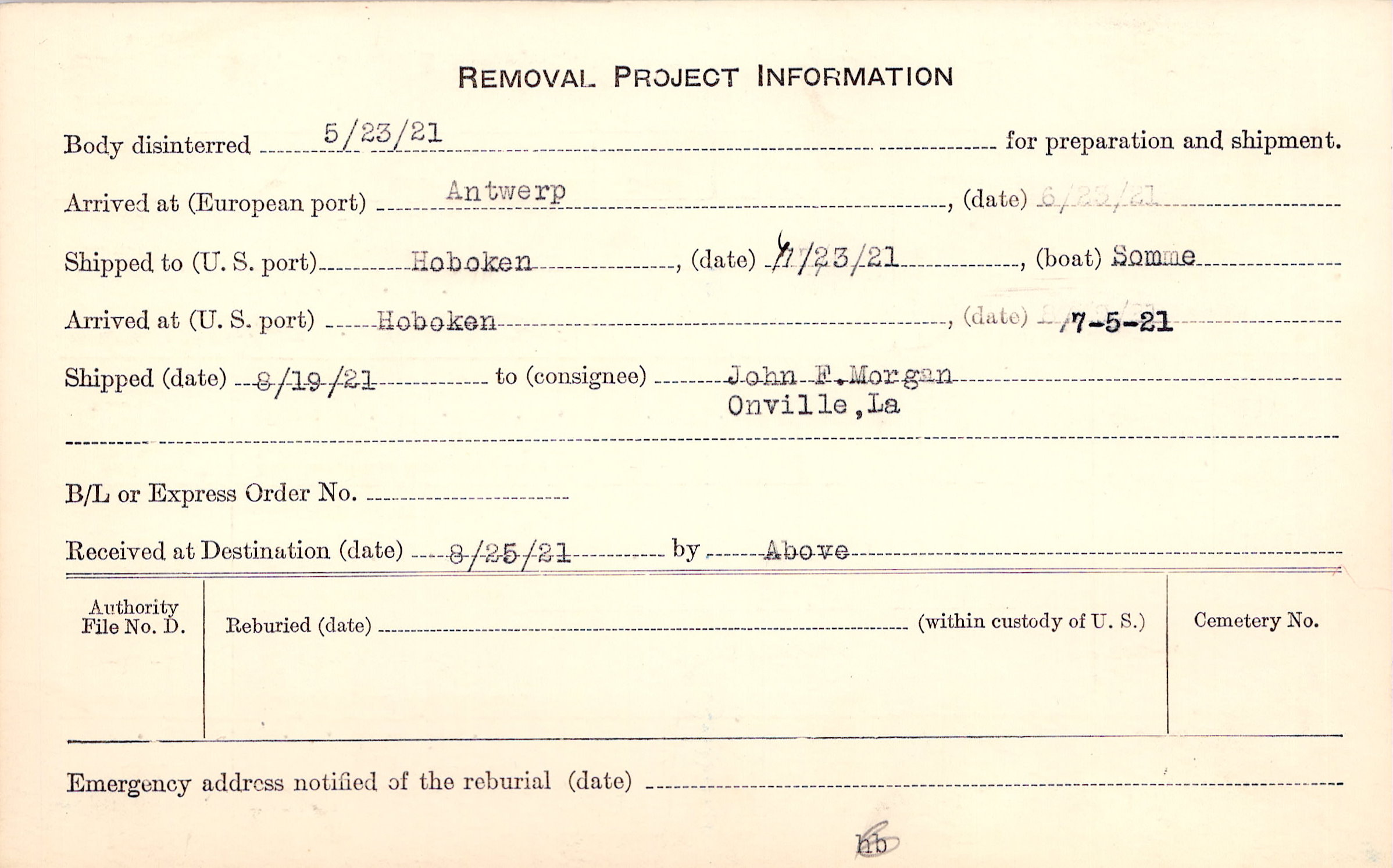 Body disinterred 5/23/1921 for preparation and shipment.