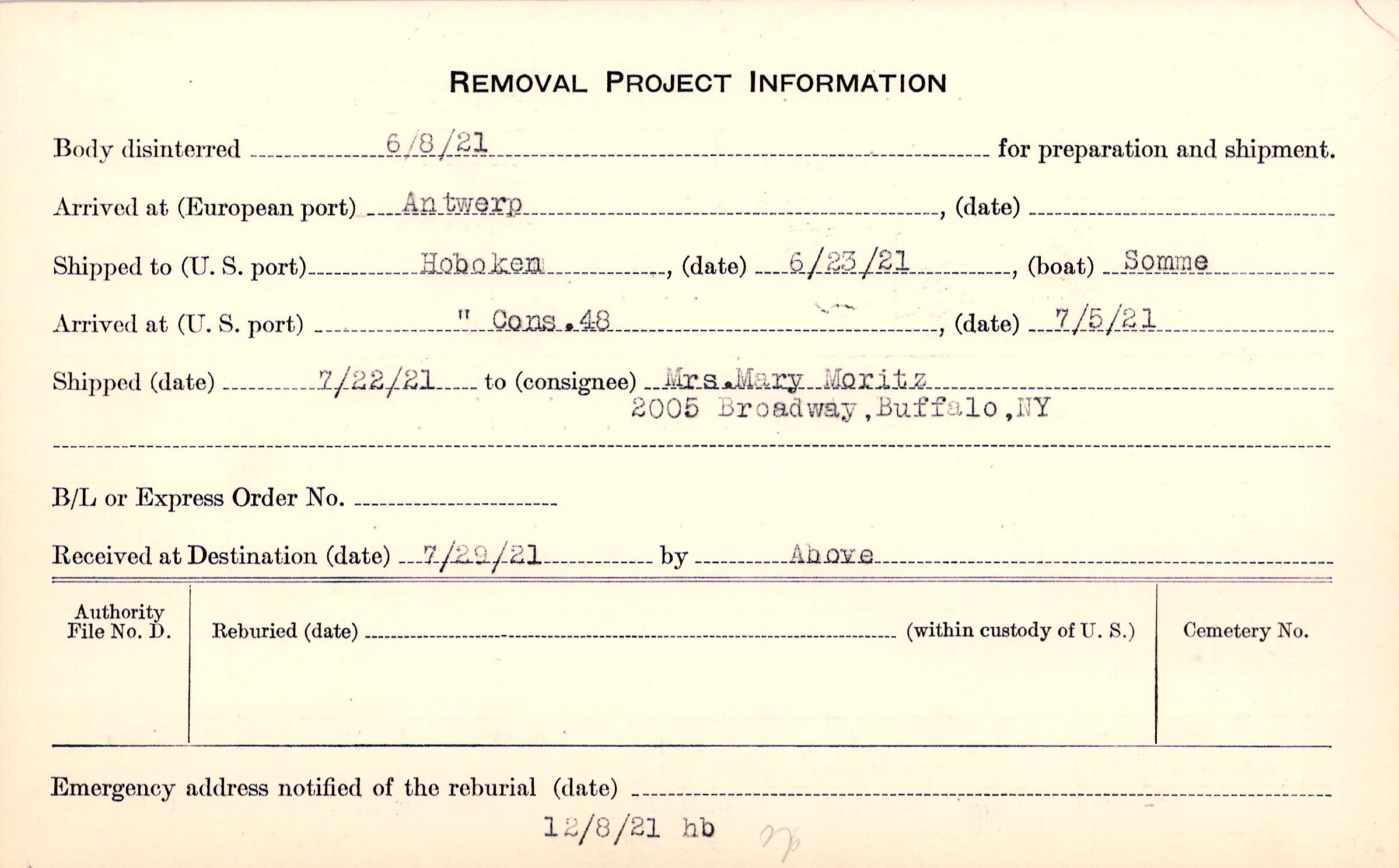 Body disinterred 6/8/1921 for preparation and shipment.