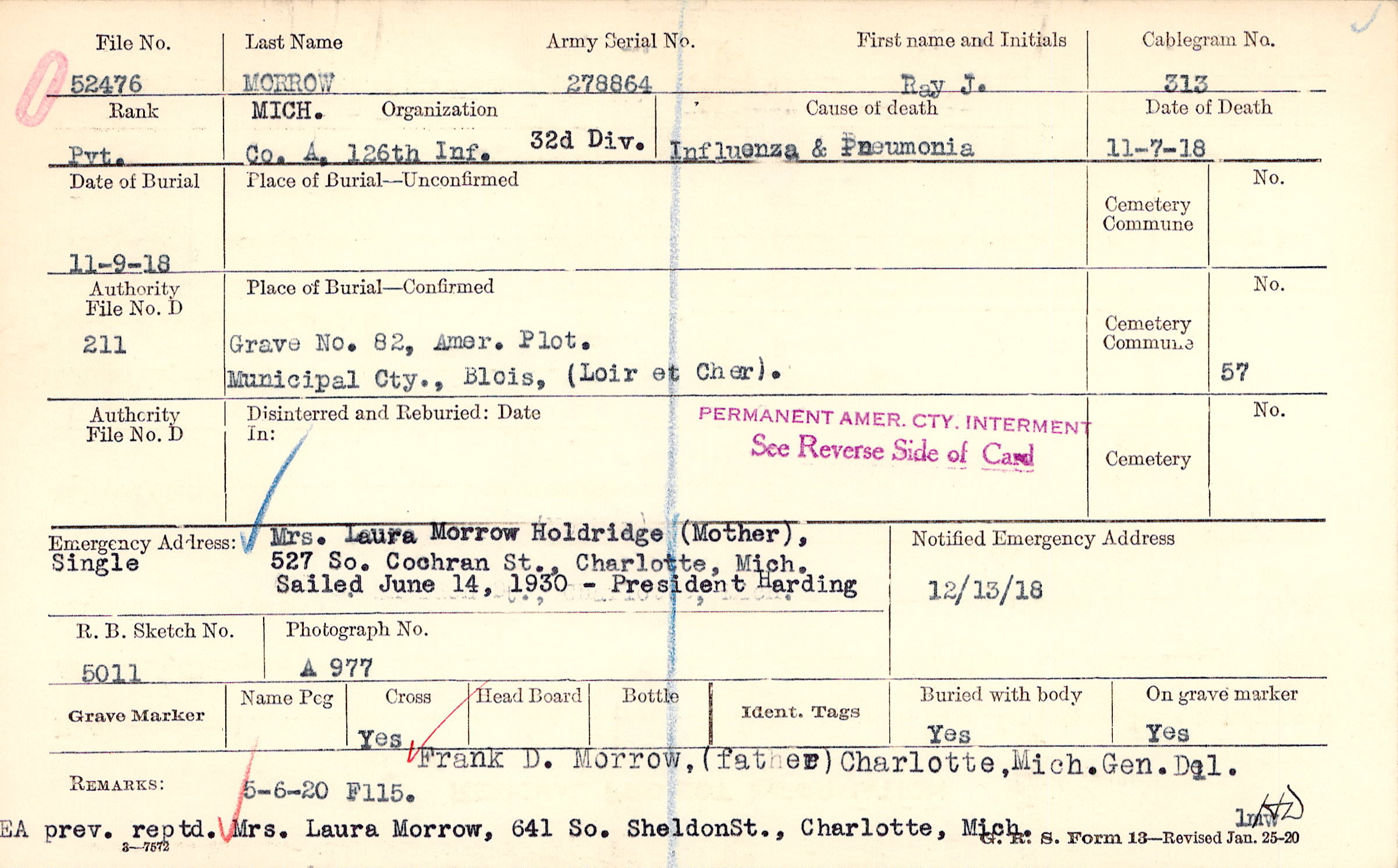 Frank D. Morrow, (father) Charlotte, Mich. Gen. Del. EA prev. reptd. Mrs. Laura Morrow, 641 So. Sheldon St., Charlotte, Mich., 5-6-20 F115.