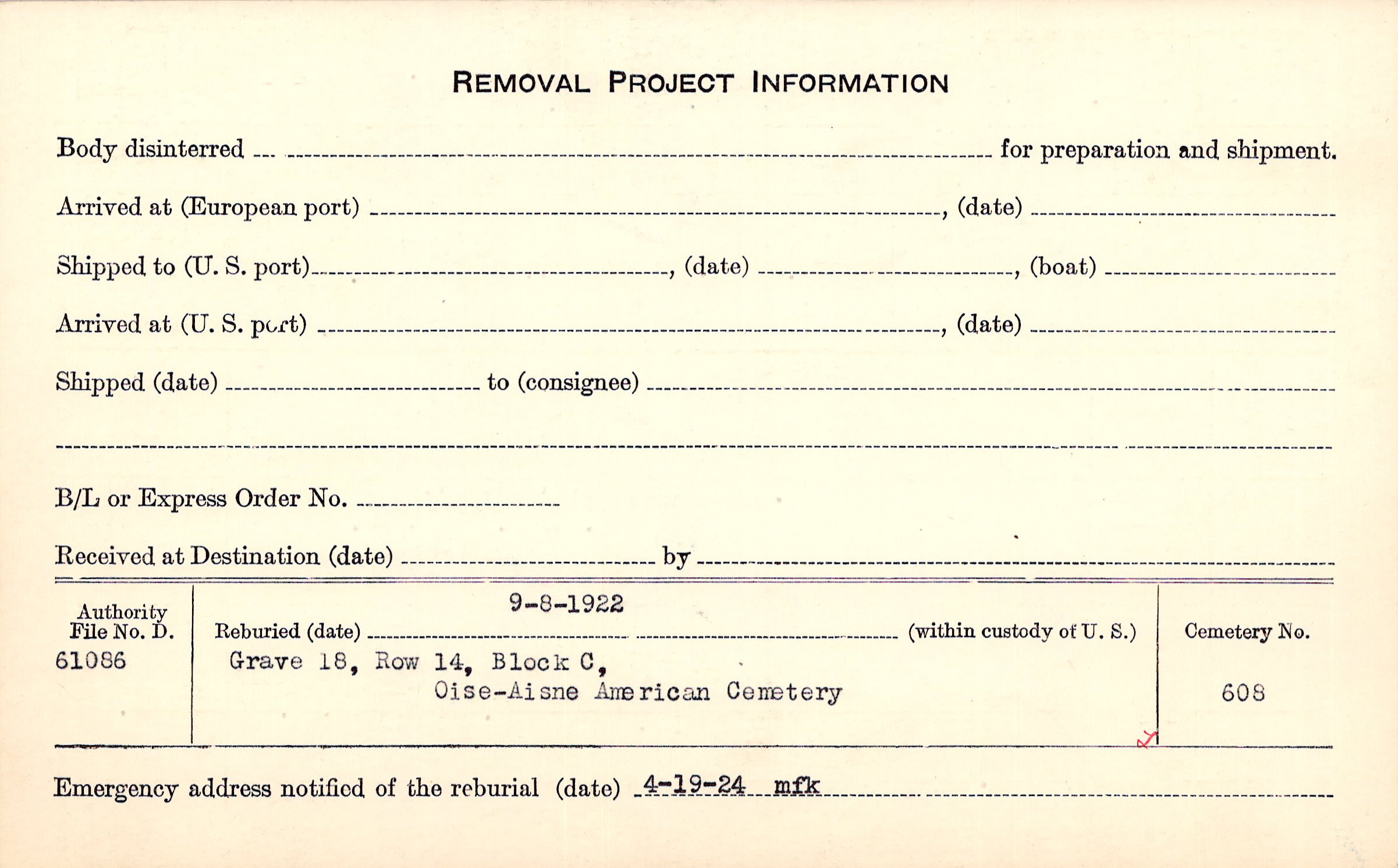 Grave 82, Amer. Plot. ,Municipal Cty., Blois, (Loir et Cher).