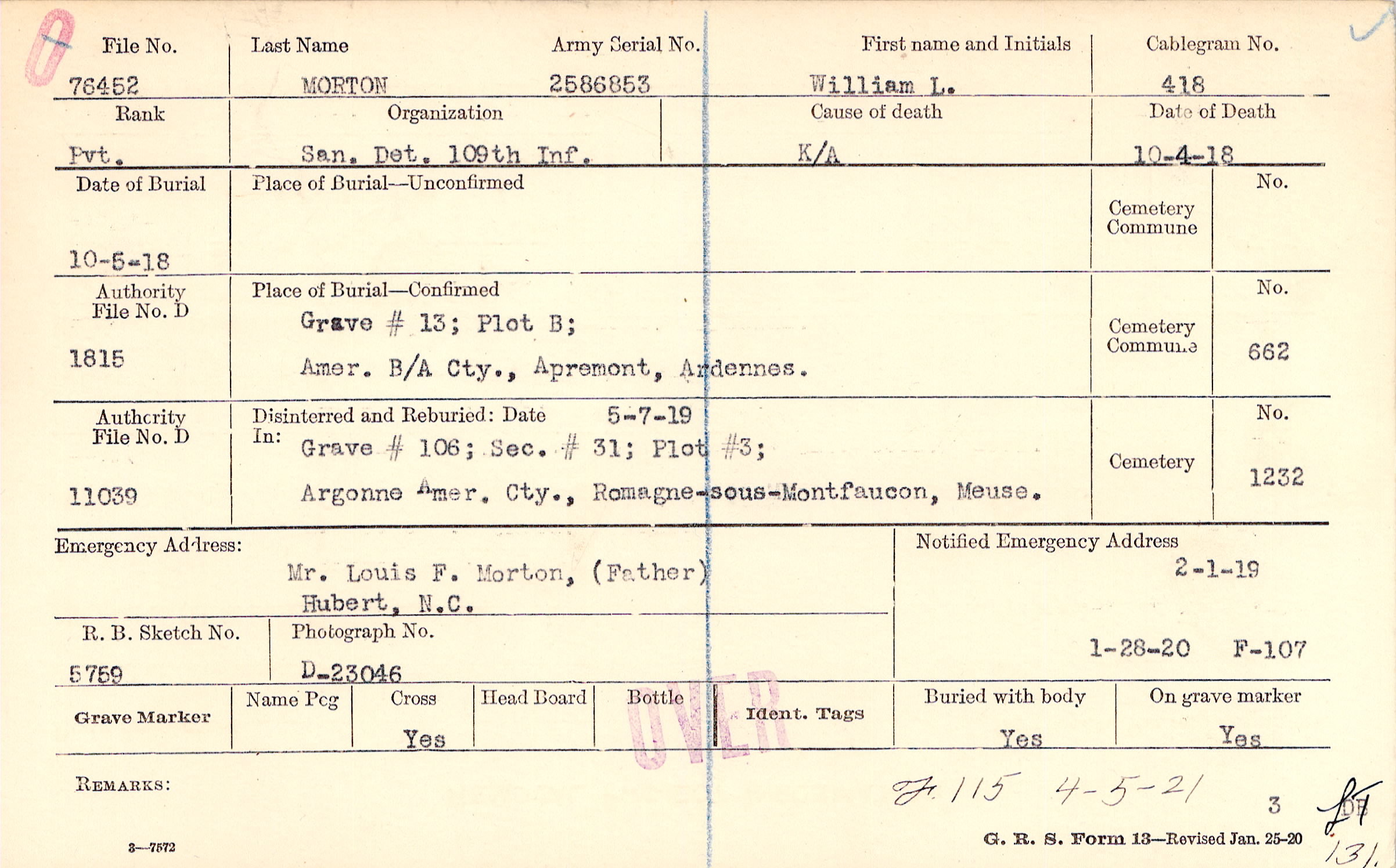 Grave 106, Section 31, Plot 3, Argonne American Cemetery, Romagne-sous-Montfaucon, Meuse