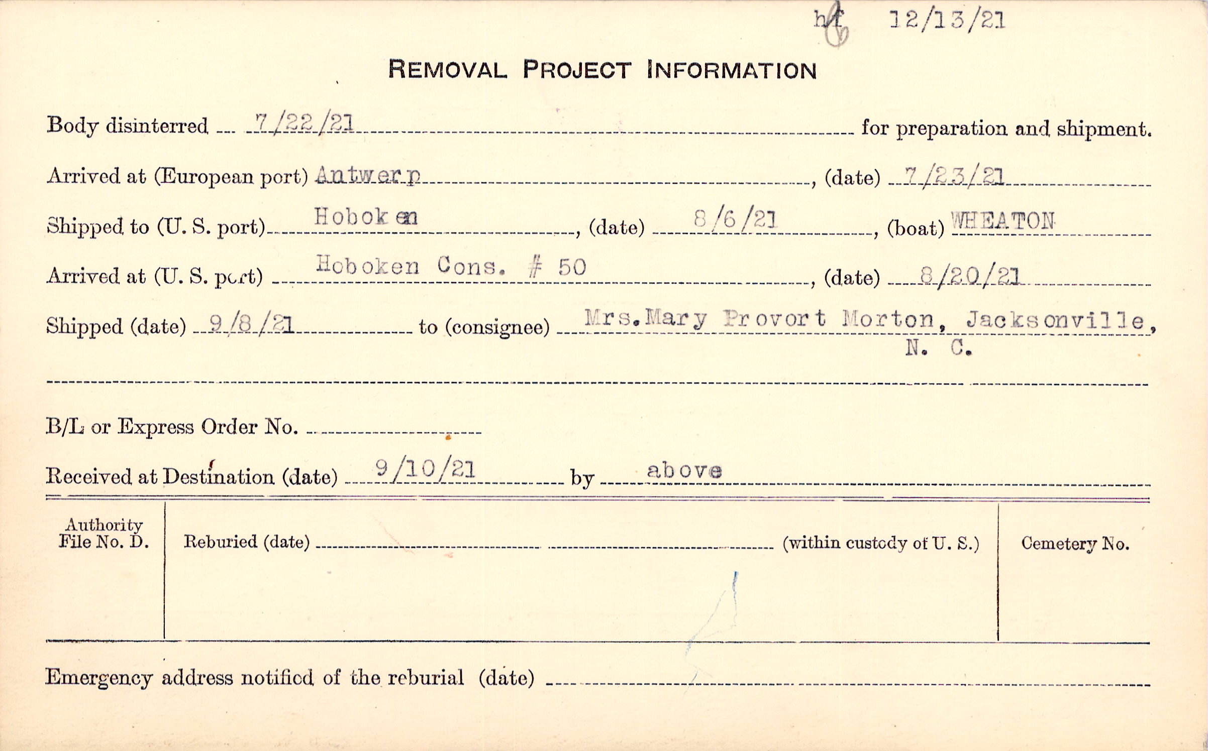 Body disinterred 7/22/1921 for preparation and shipment.