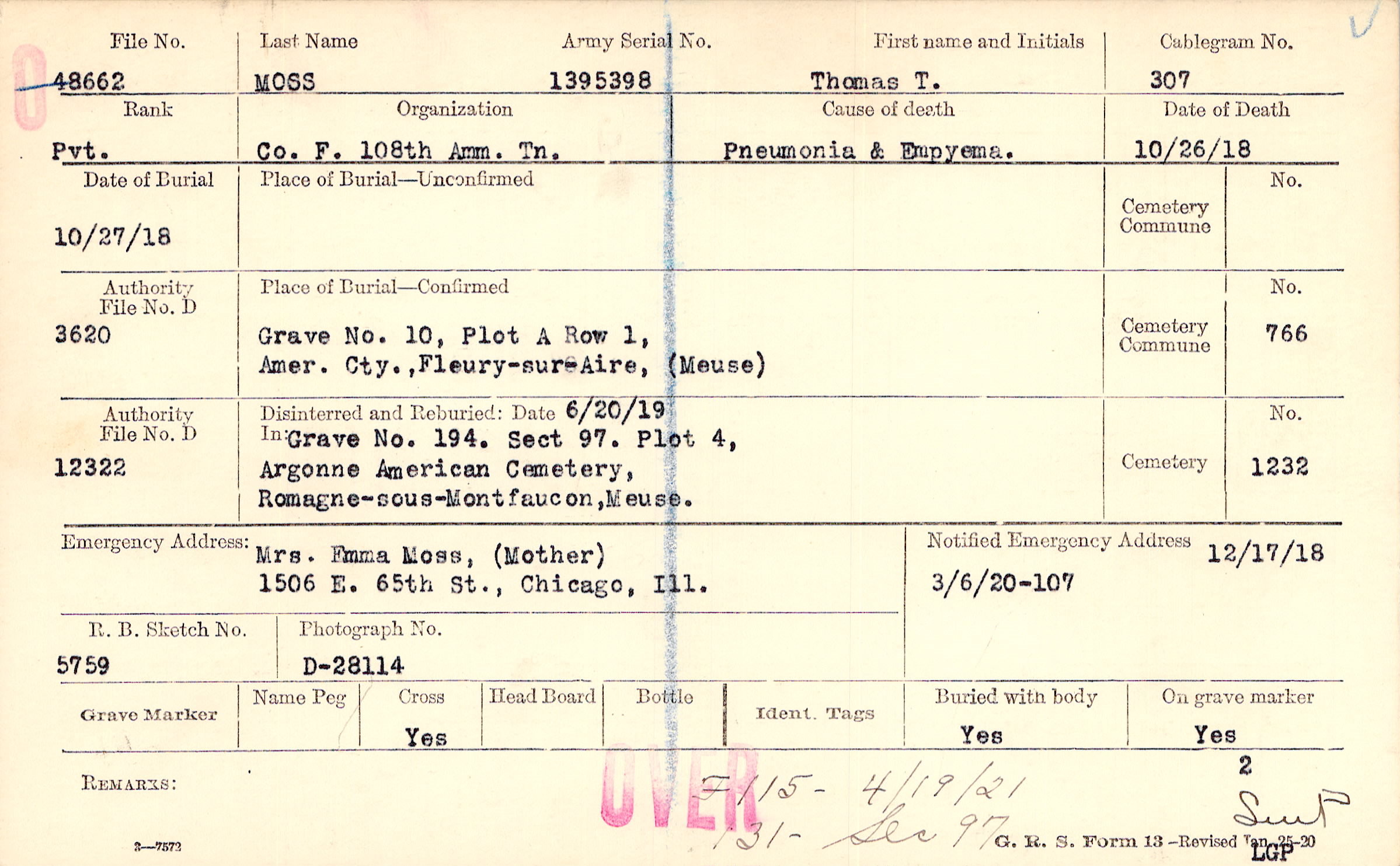 Mrs. Emma Moss, (Mother), 1506 E. 65th St., Chicago, Ill.