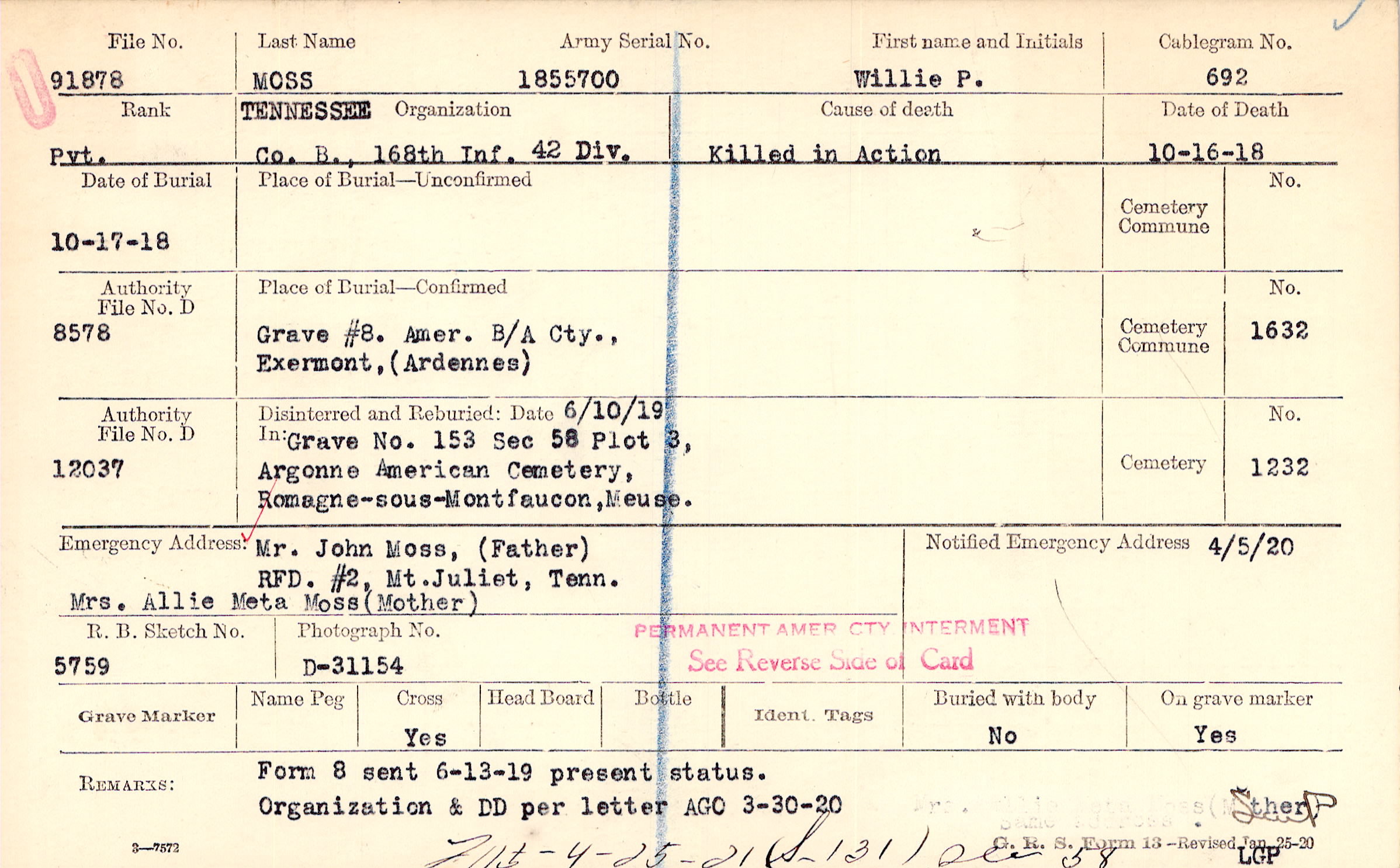 Mr. John Moss (Father), RFD. #2, Mt. Juliet, Tenn., Mrs. Allie Meta Moss (Mother)