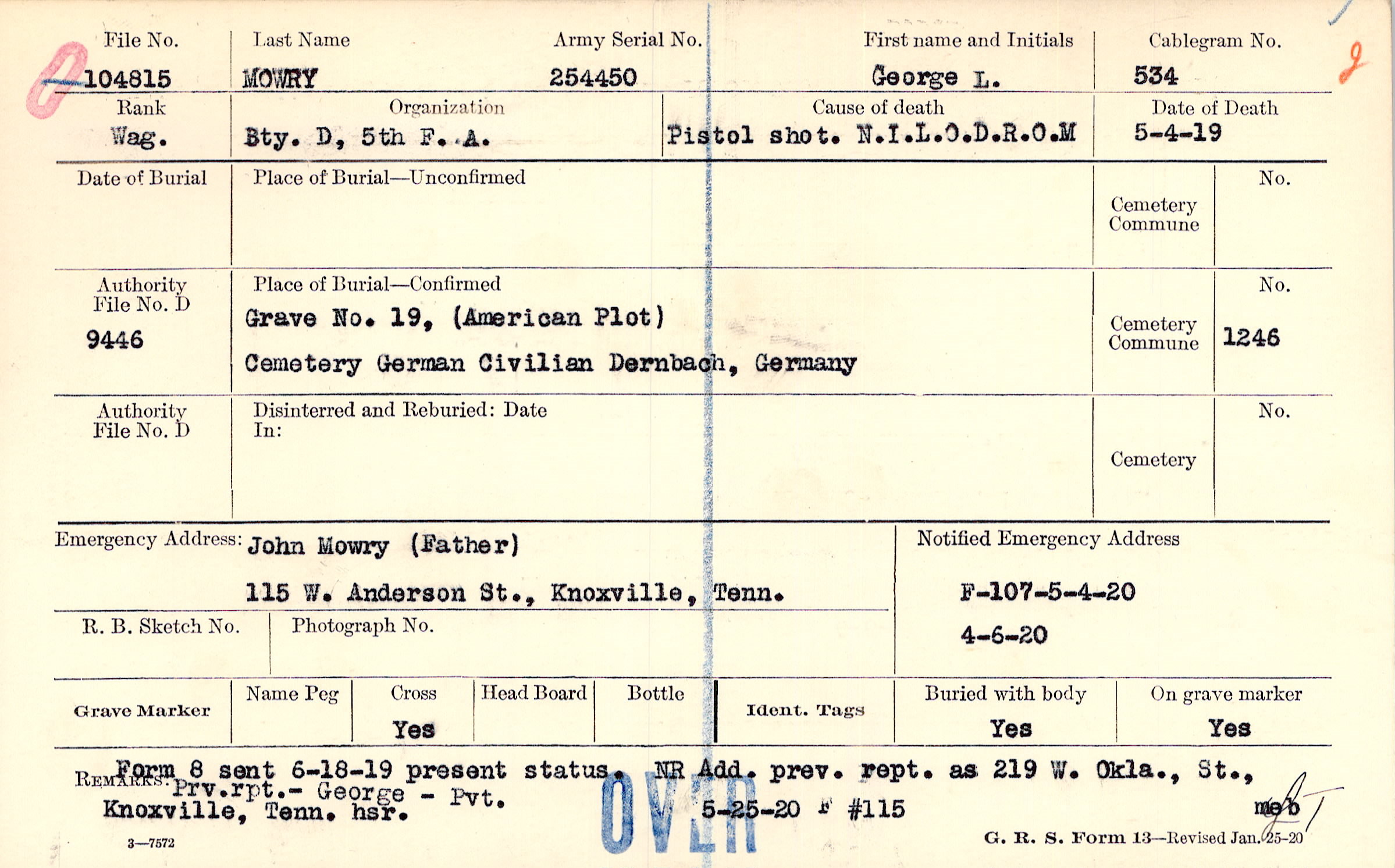 NR Add.; prev. rept. as 219 W. Okla., St., Knoxville, Tenn. hsr. Prv. rpt.- George - Pvt., Form 8 sent 6-18-19 present status., 5-25-20 F#115