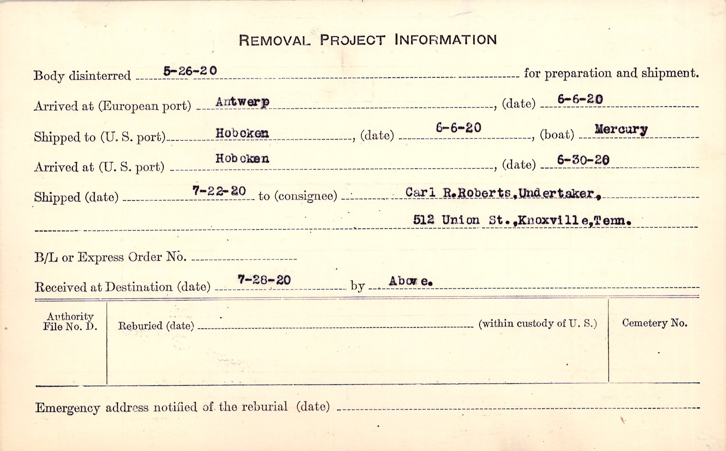 to Carl. R. Roberts, Undertaker, 512 Union St., Knoxville, Tenn.