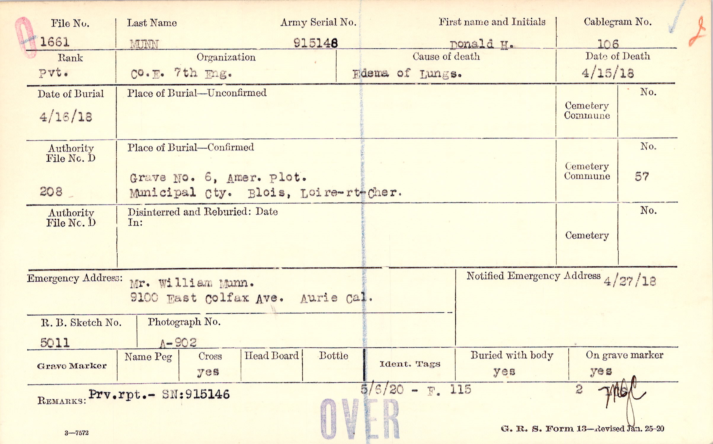 Grave 6, Amer. Plot., ,Municipal Cty. Blois, Loire-rt-Cher.