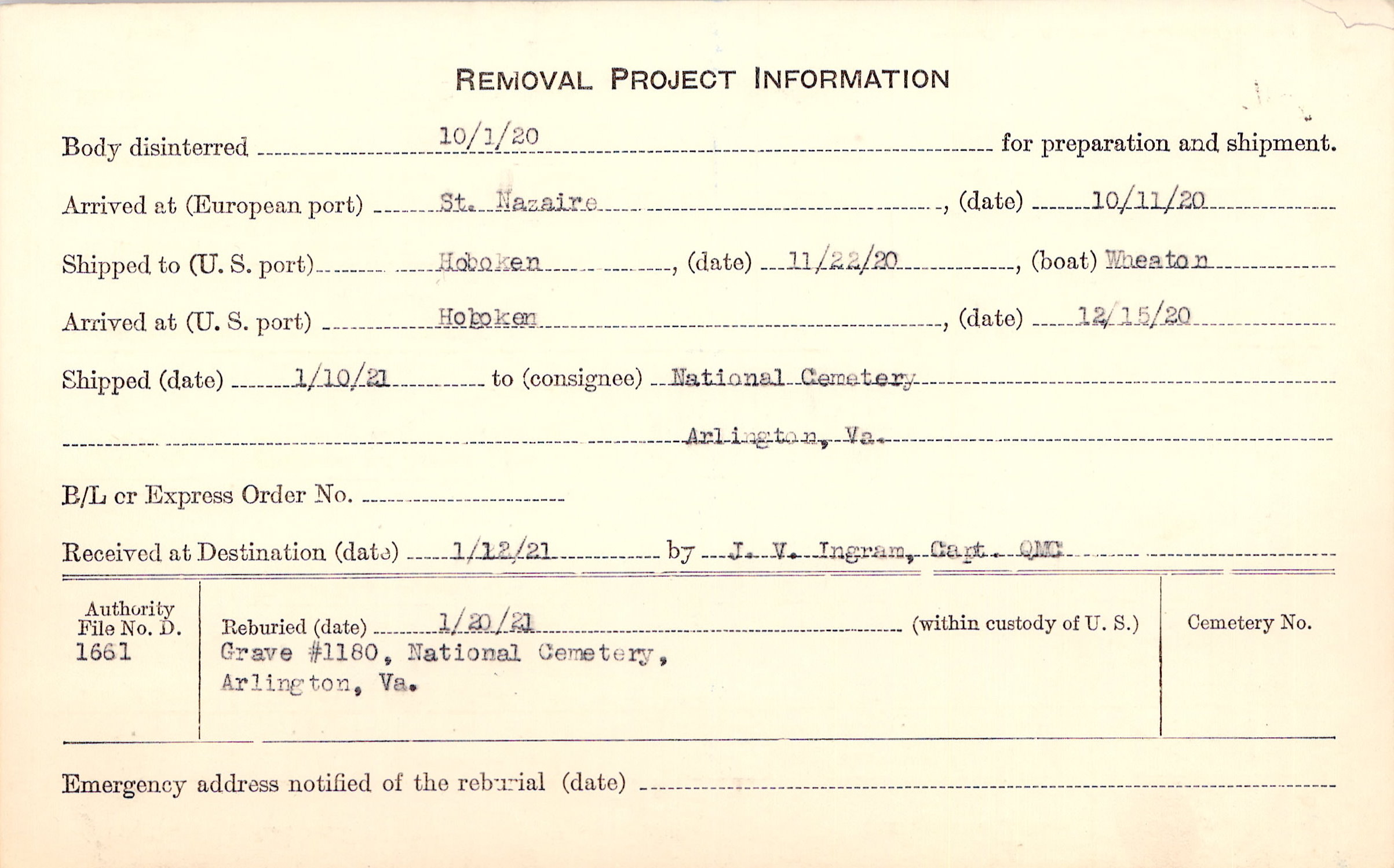 Body disinterred 10/1/1920 for preparation and shipment.