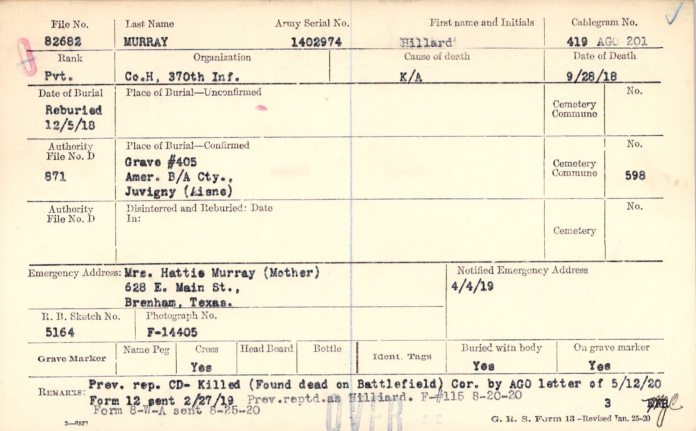 Prev. rep. CD- Killed (Found dead on Battlefield) Cor. by AGO letter of 5/12/20 Prev. reptd. as Hilliard, Form 8-W-A sent 8-25-20, Form 12 sent 2/27/19, Prev.reptd. as Hilliard. F-#115 8-20-20