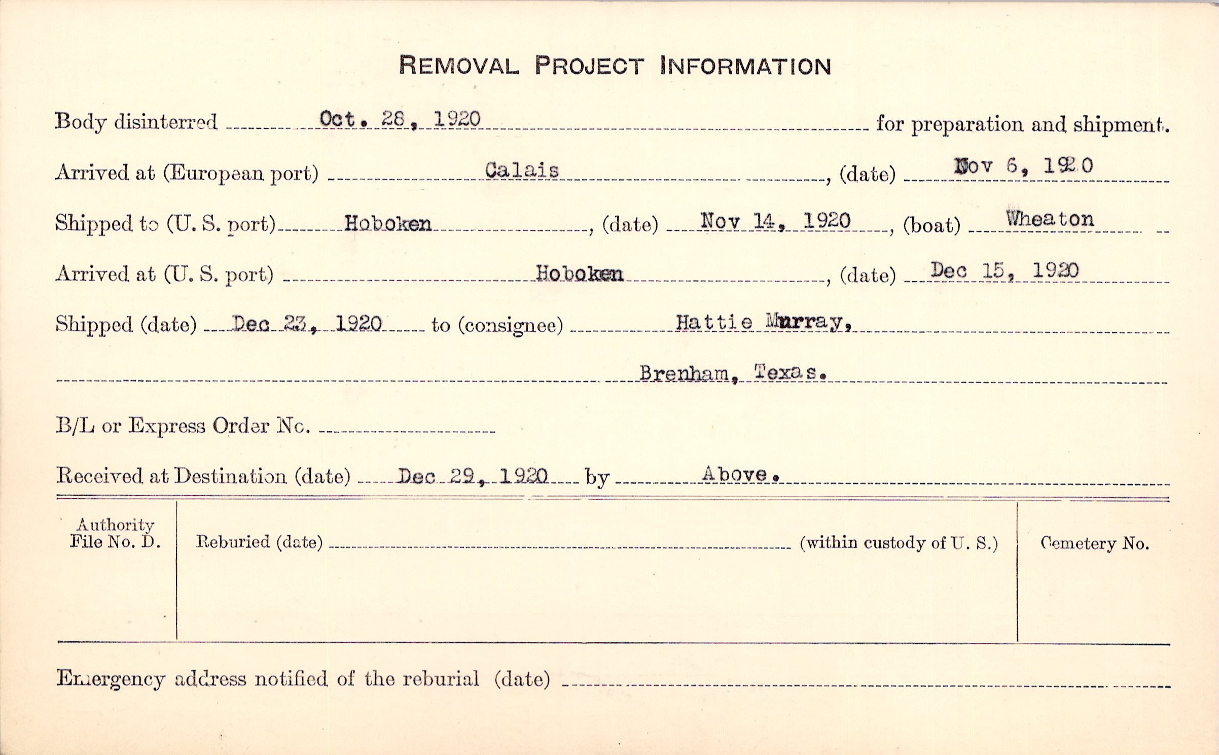 Mrs. Hattie Murray (Mother), 628 E. Main St., Brenham, Texas.