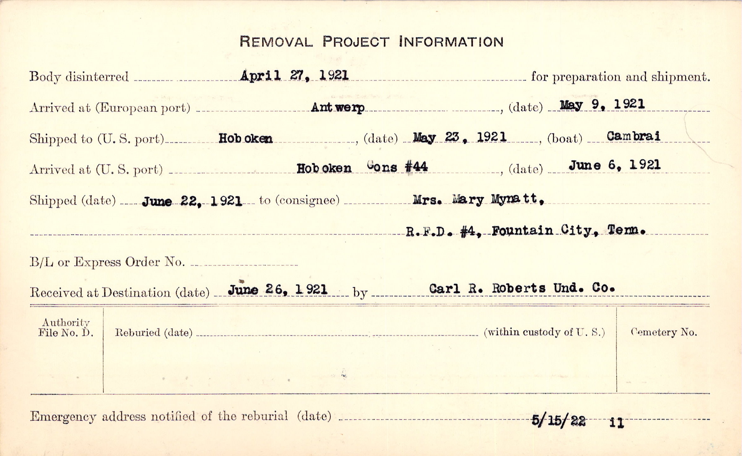 Body disinterred 4/27/1921 for preparation and shipment.