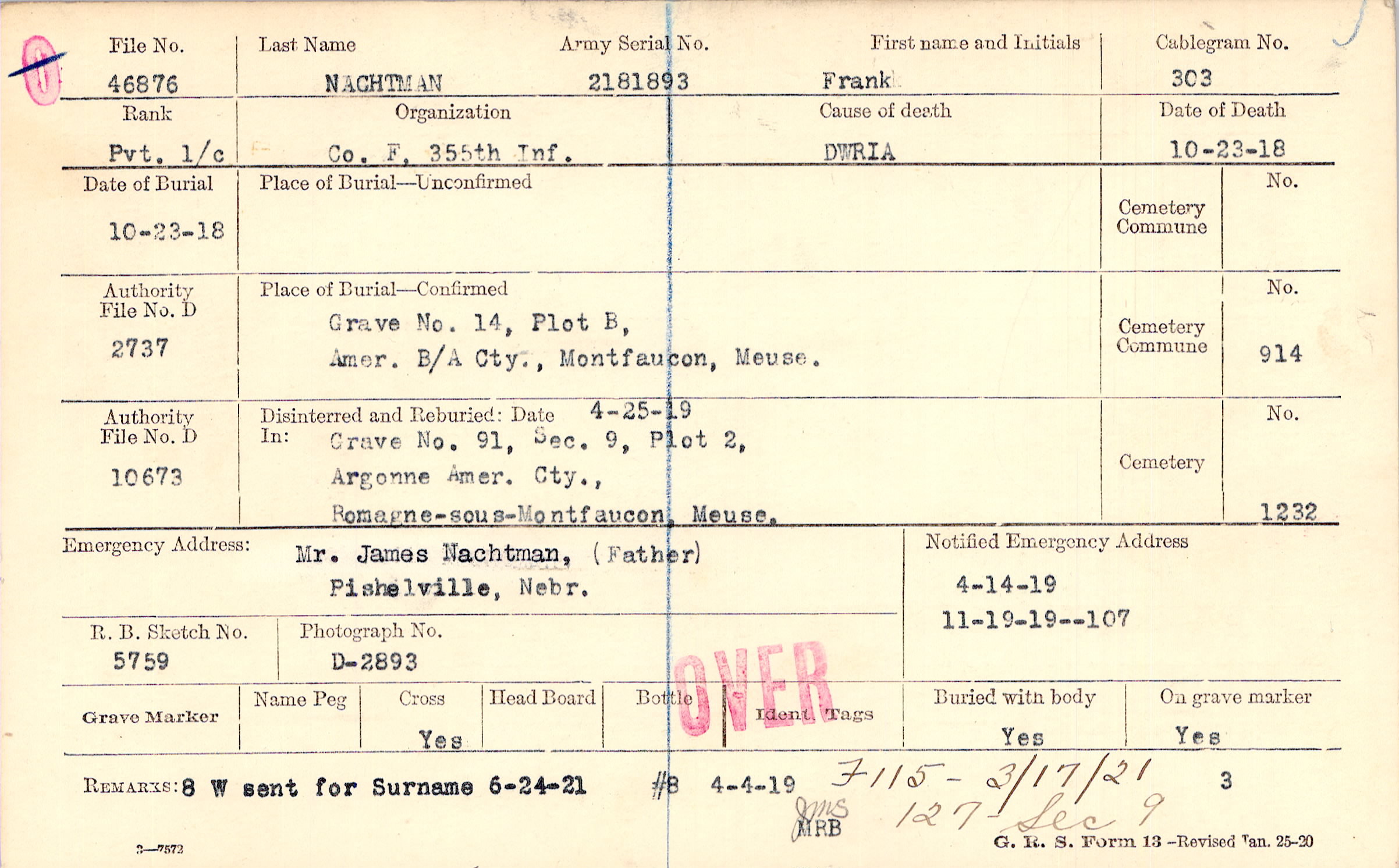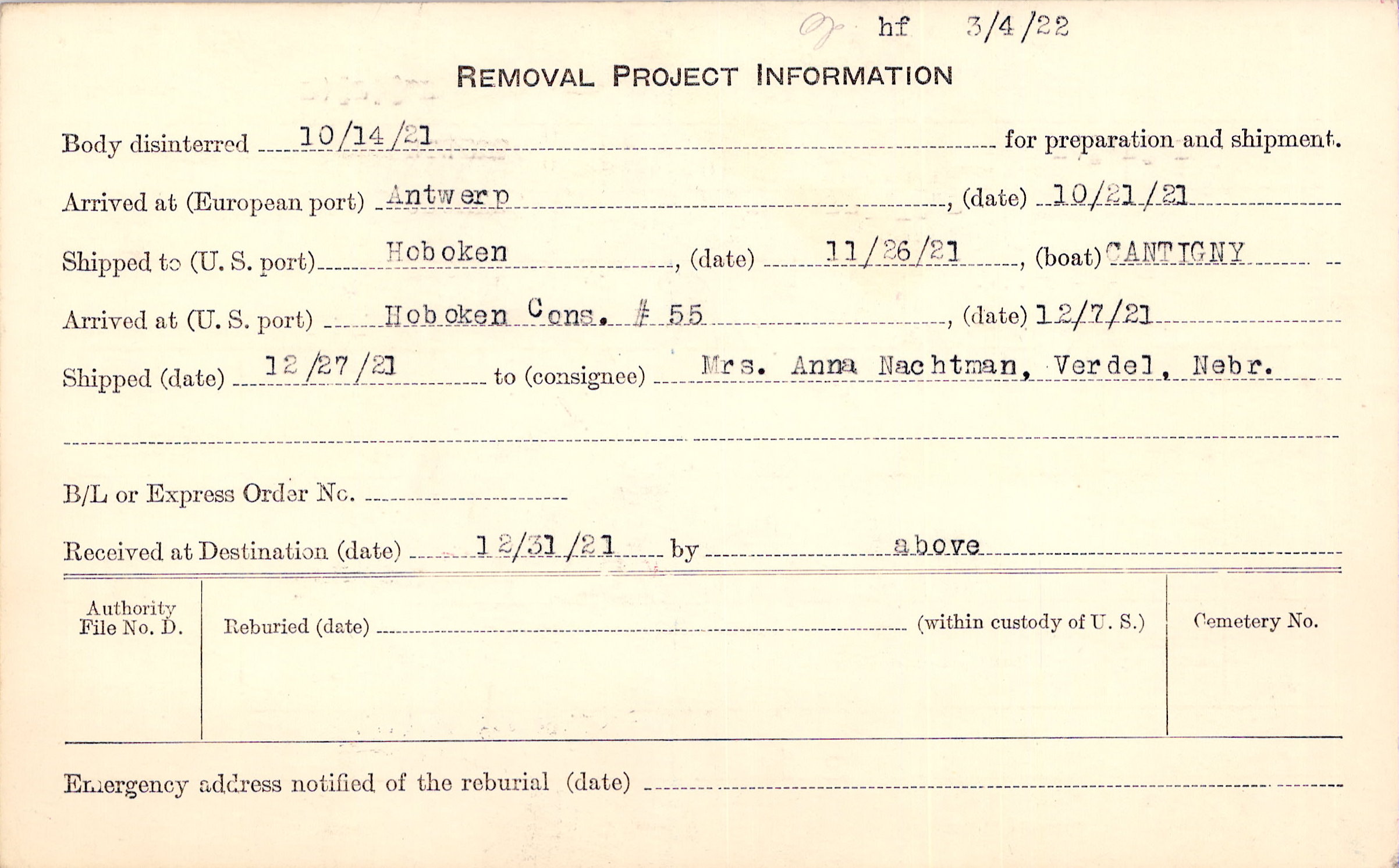 Body disinterred 10/14/1921 for preparation and shipment.
