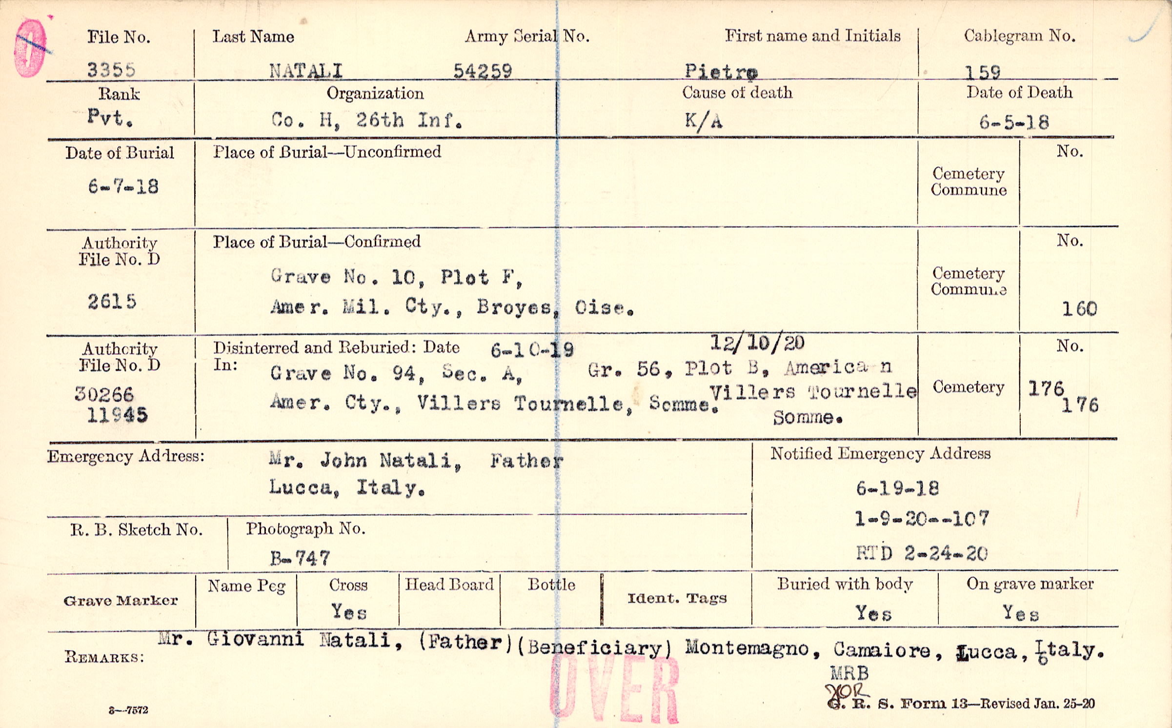 Mr. Giovanni Natali, (Father) (Beneficiary) Montemagno, Camaiore, Lucca, Italy.