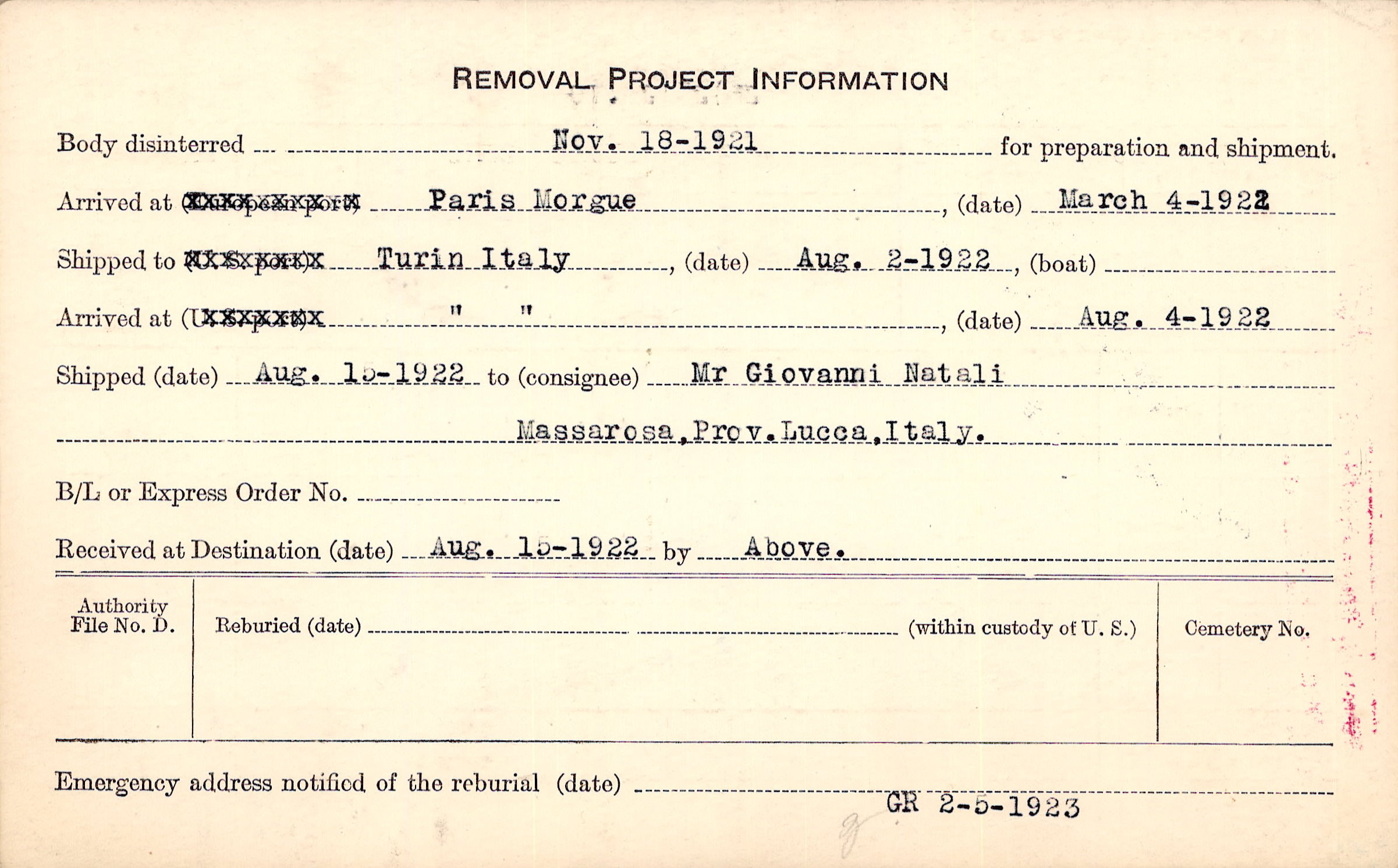 Body disinterred 11/18/1921 for preparation and shipment.
