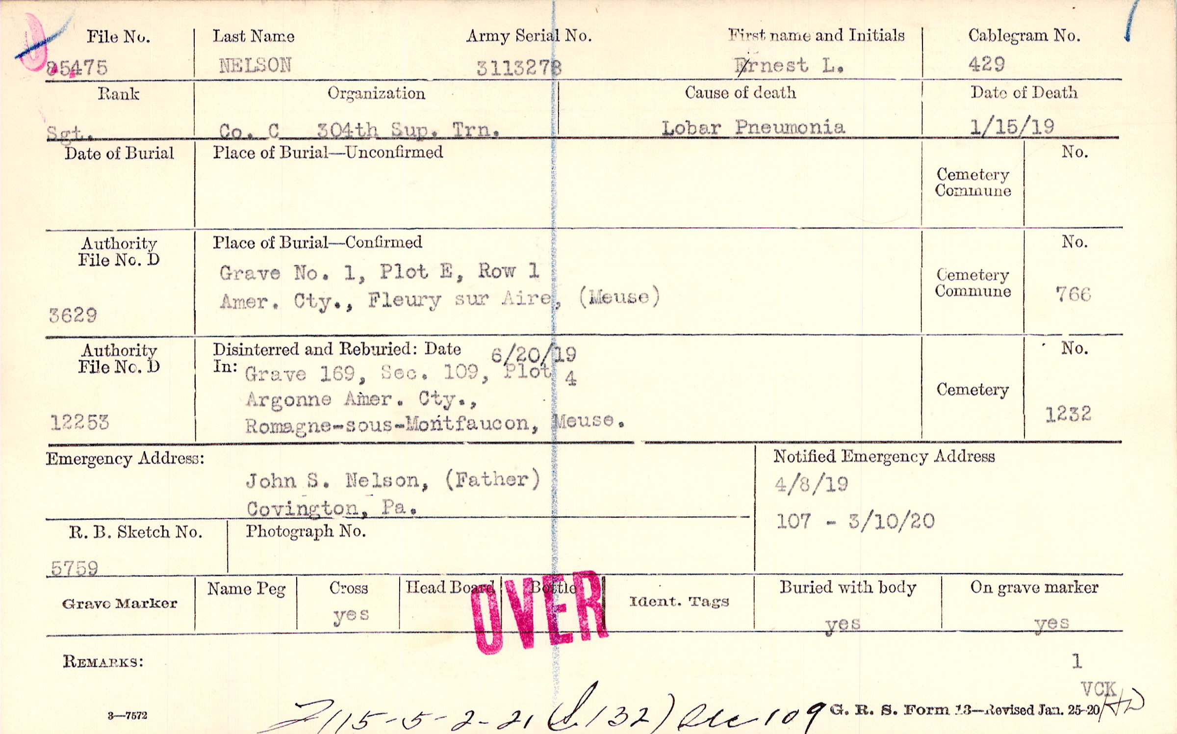 Grave 169, Section 109, Plot 4, Argonne American Cemetery, Romagne-sous-Montfaucon, Meuse