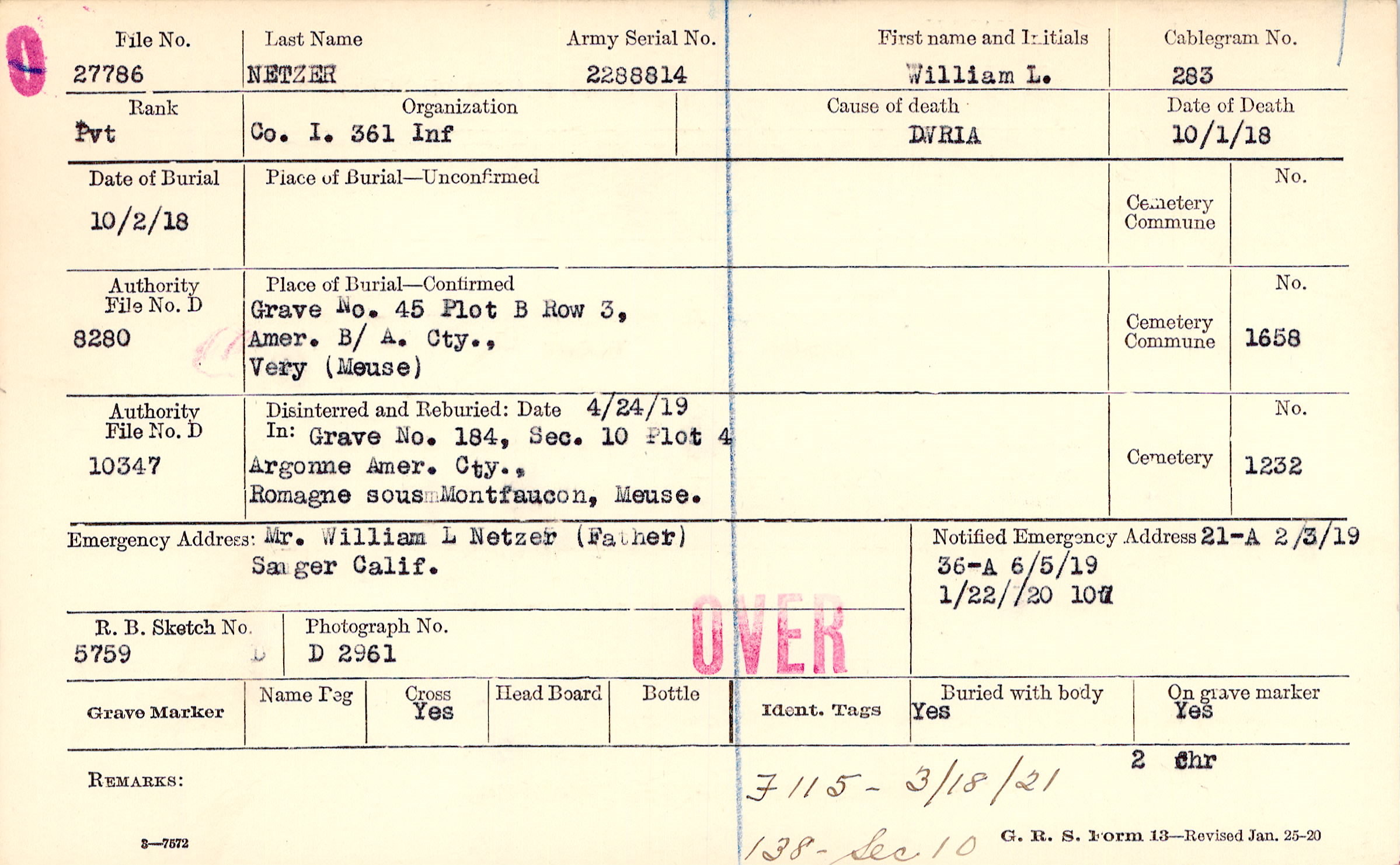 Grave 184, Section 10, Plot 4, Argonne American Cemetery, Romagne-sous-Montfaucon, Meuse